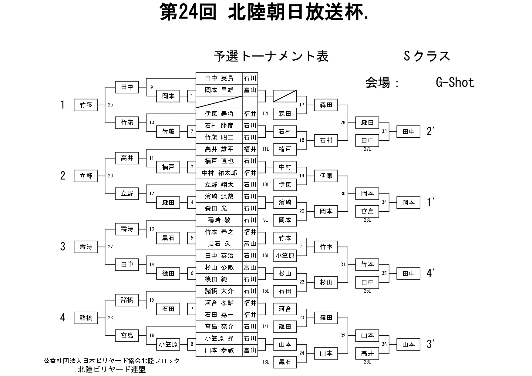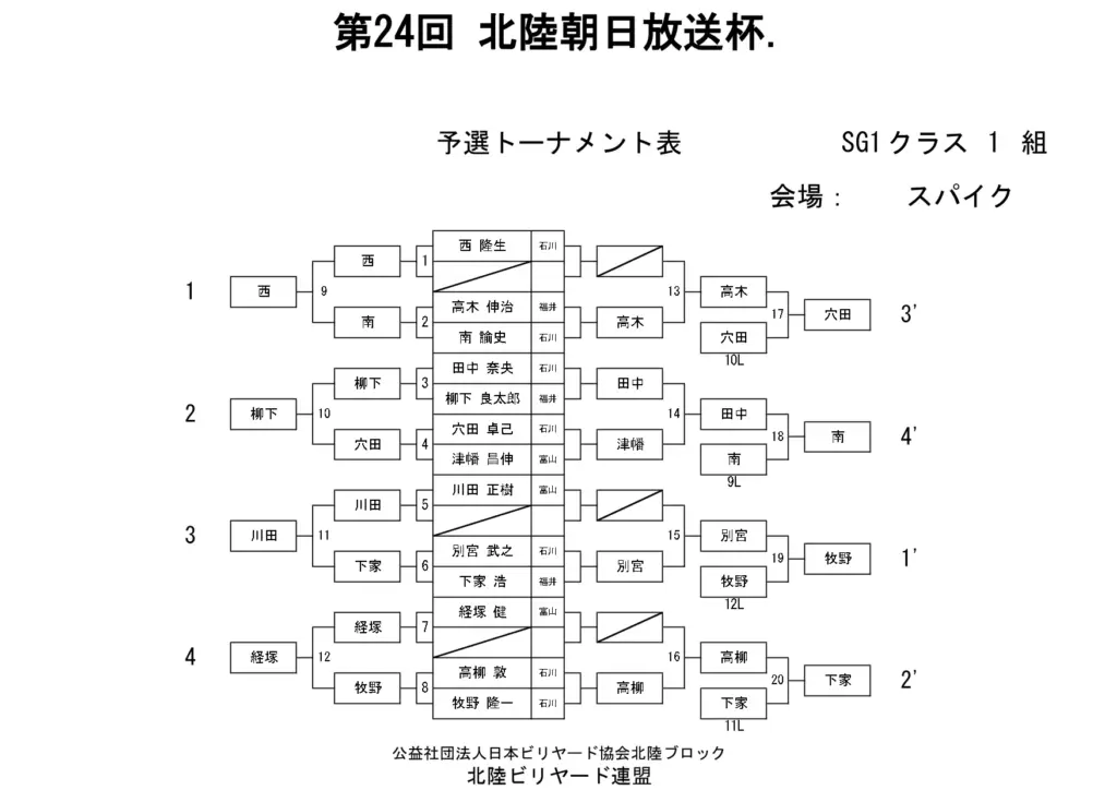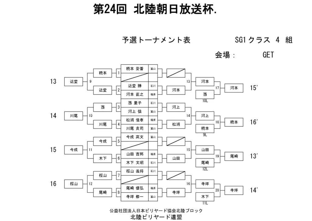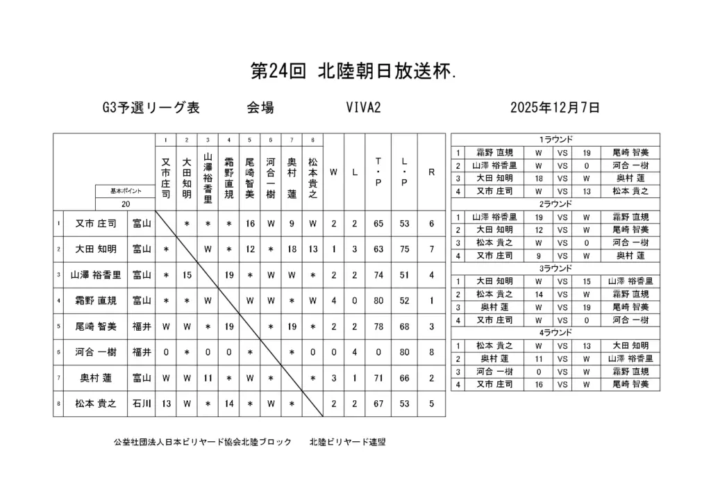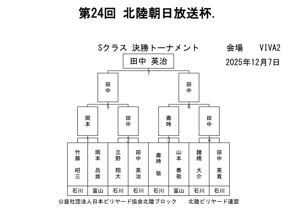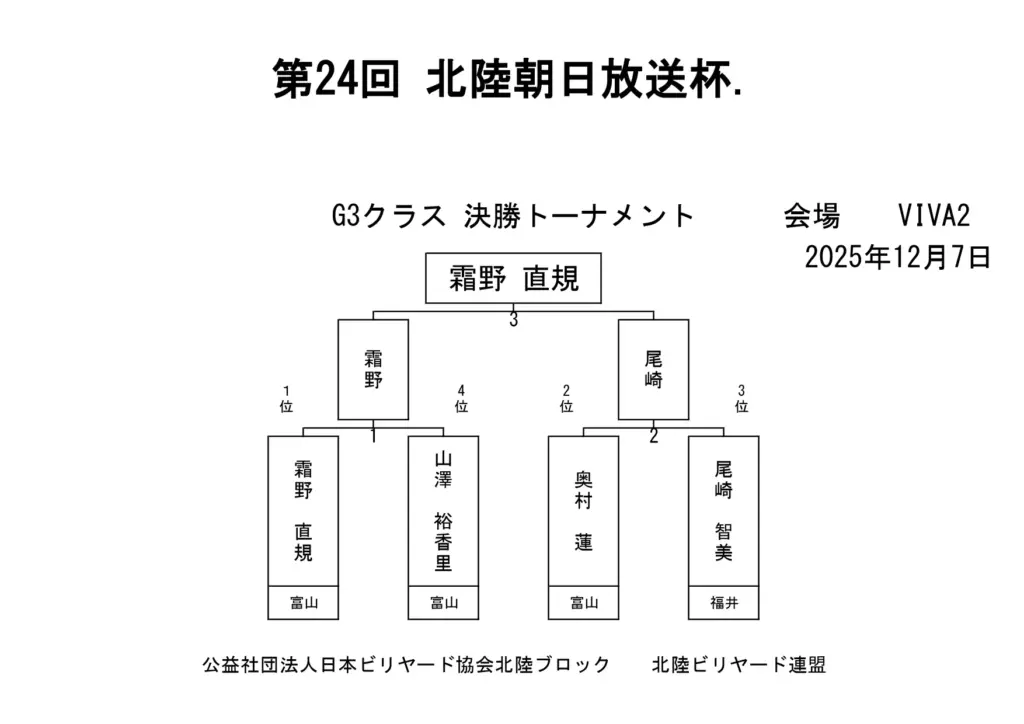 第24回北陸朝日放送杯 試合結果 2025.12.07 S クラス 優 勝田中 英治(石川)準優勝田中英貴(石川)3位タイ岡本 昌雄(富山)3位タイ壽時 敬(石川) SG1 クラス 優 勝渡邊 亮(富山)準優勝木水 洸平(福井)3位タイ河本 直之(福井)3位タイ下家 浩(福井) G1 クラス 優 勝田中 久一(福井) 準優勝谷口 義樹(福井)3位タイ小山 登(石川)3位タイ村本 健(石川) G2 クラス 優 勝若月 駿寛(富山)準優勝黒川 吉雄(富山)3位タイ岡本 翼(石川)3位タイ立花 千雅(富山) G3 クラス 優 勝霜野 直規(富山) 準優勝尾崎 智美(福井) 3位タイ山澤 裕香里 (富山)3位タイ奥村 蓮 (富山) G4 クラス 優 勝青山 央(富山)準優勝木本 皐輝(富山) 3位タイ田口 大惺(石川)3位タイ岩田 拓人(富山)