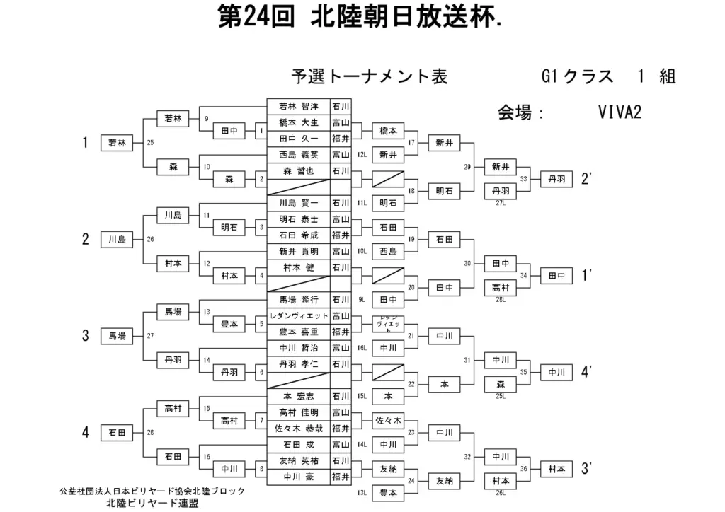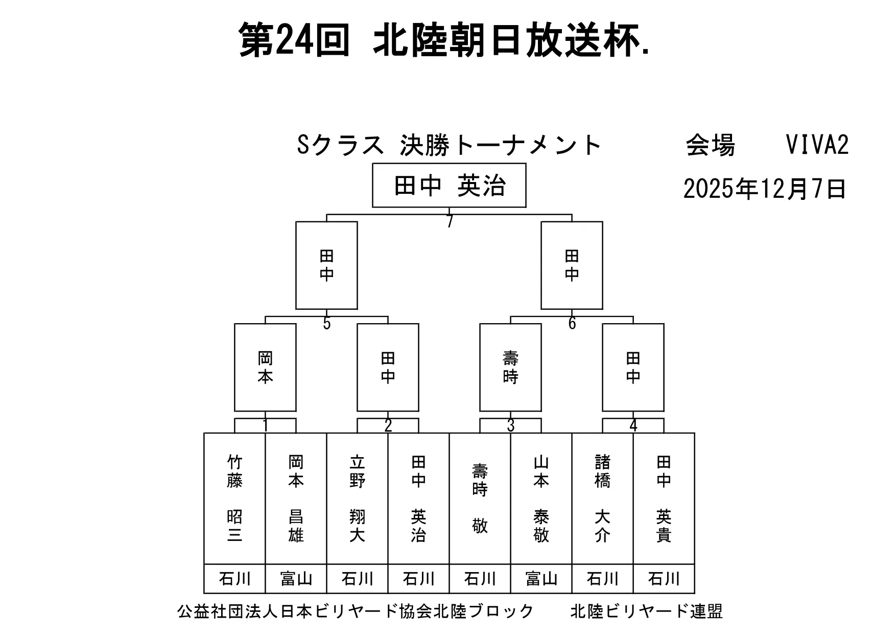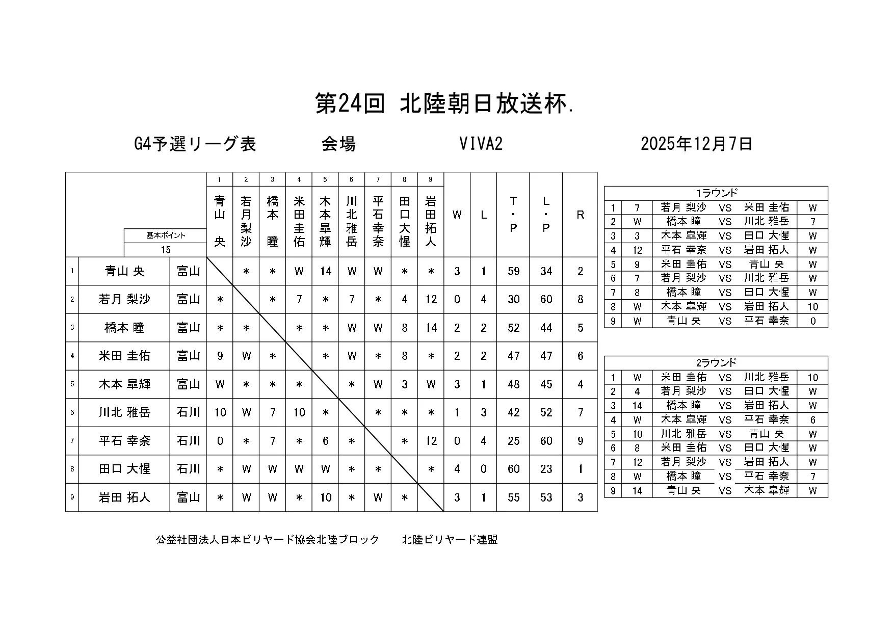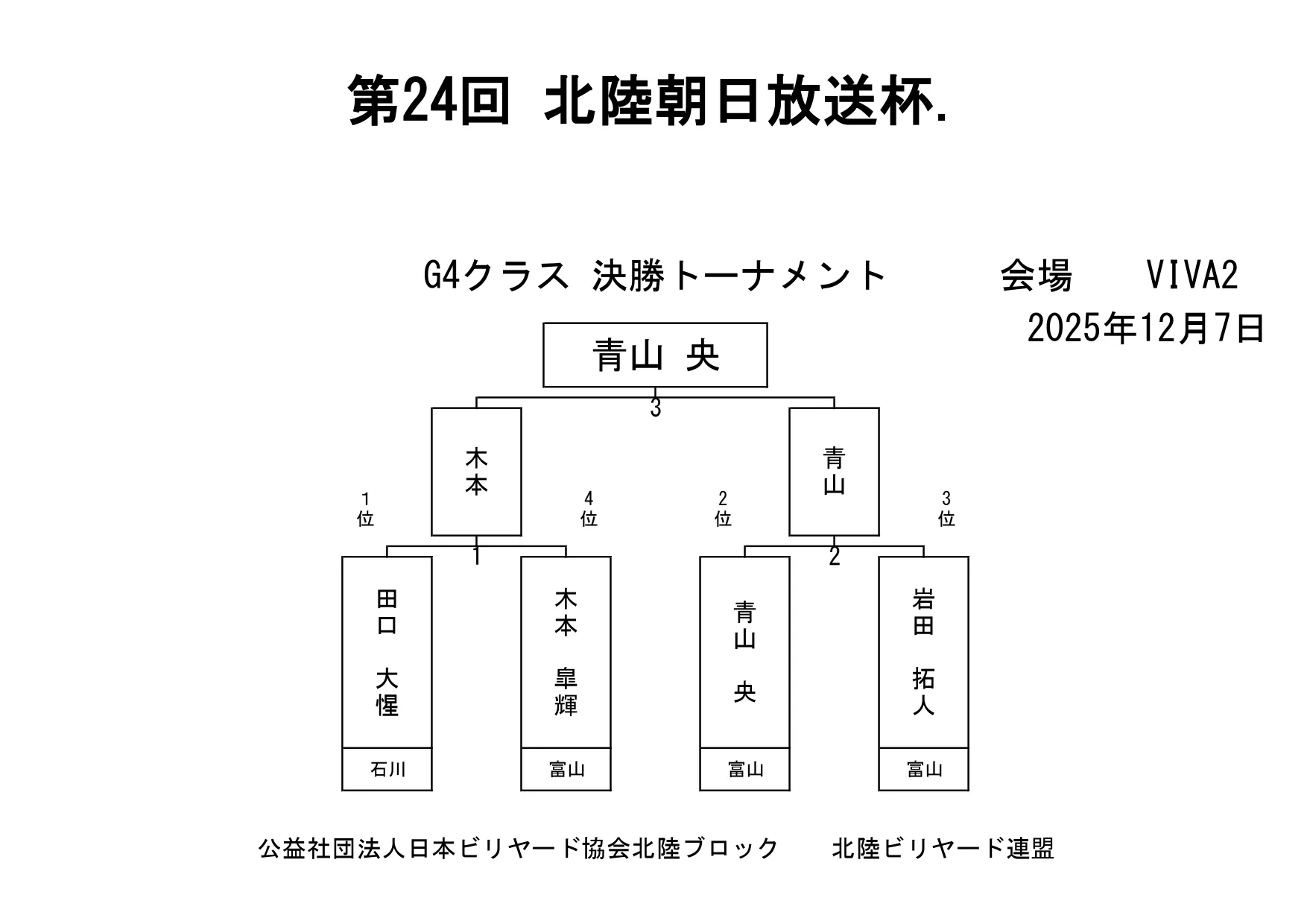 第24回北陸朝日放送杯 試合結果 2025.12.07 S クラス 優 勝田中 英治(石川)準優勝田中英貴(石川)3位タイ岡本 昌雄(富山)3位タイ壽時 敬(石川) SG1 クラス 優 勝渡邊 亮(富山)準優勝木水 洸平(福井)3位タイ河本 直之(福井)3位タイ下家 浩(福井) G1 クラス 優 勝田中 久一(福井) 準優勝谷口 義樹(福井)3位タイ小山 登(石川)3位タイ村本 健(石川) G2 クラス 優 勝若月 駿寛(富山)準優勝黒川 吉雄(富山)3位タイ岡本 翼(石川)3位タイ立花 千雅(富山) G3 クラス 優 勝霜野 直規(富山) 準優勝尾崎 智美(福井) 3位タイ山澤 裕香里 (富山)3位タイ奥村 蓮 (富山) G4 クラス 優 勝青山 央(富山)準優勝木本 皐輝(富山) 3位タイ田口 大惺(石川)3位タイ岩田 拓人(富山)