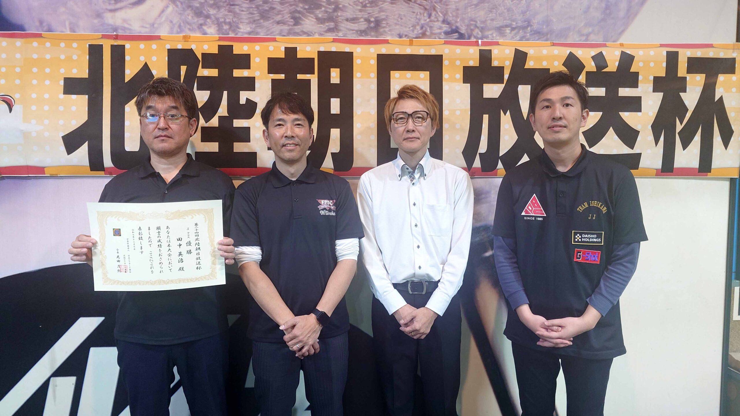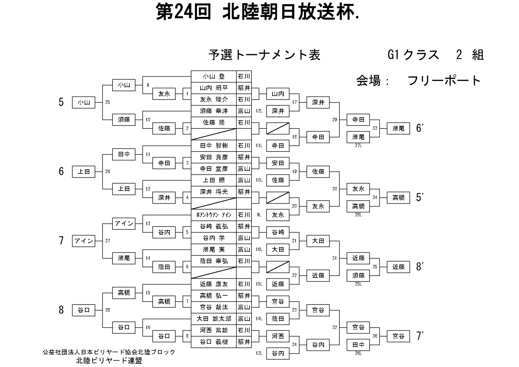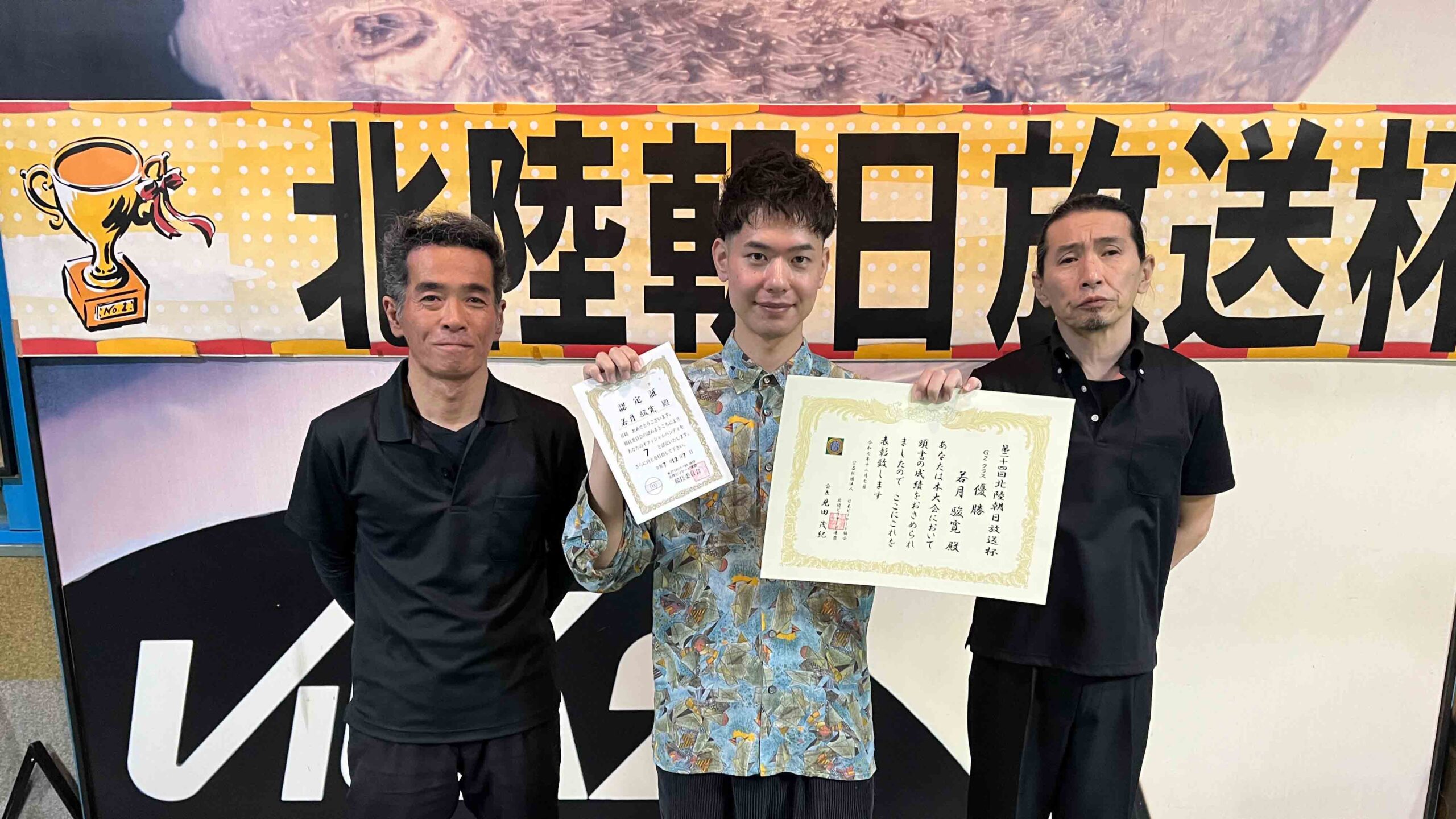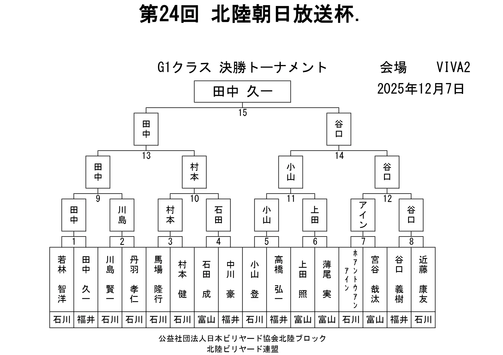 第24回北陸朝日放送杯 試合結果 2025.12.07 S クラス 優 勝田中 英治(石川)準優勝田中英貴(石川)3位タイ岡本 昌雄(富山)3位タイ壽時 敬(石川) SG1 クラス 優 勝渡邊 亮(富山)準優勝木水 洸平(福井)3位タイ河本 直之(福井)3位タイ下家 浩(福井) G1 クラス 優 勝田中 久一(福井) 準優勝谷口 義樹(福井)3位タイ小山 登(石川)3位タイ村本 健(石川) G2 クラス 優 勝若月 駿寛(富山)準優勝黒川 吉雄(富山)3位タイ岡本 翼(石川)3位タイ立花 千雅(富山) G3 クラス 優 勝霜野 直規(富山) 準優勝尾崎 智美(福井) 3位タイ山澤 裕香里 (富山)3位タイ奥村 蓮 (富山) G4 クラス 優 勝青山 央(富山)準優勝木本 皐輝(富山) 3位タイ田口 大惺(石川)3位タイ岩田 拓人(富山)