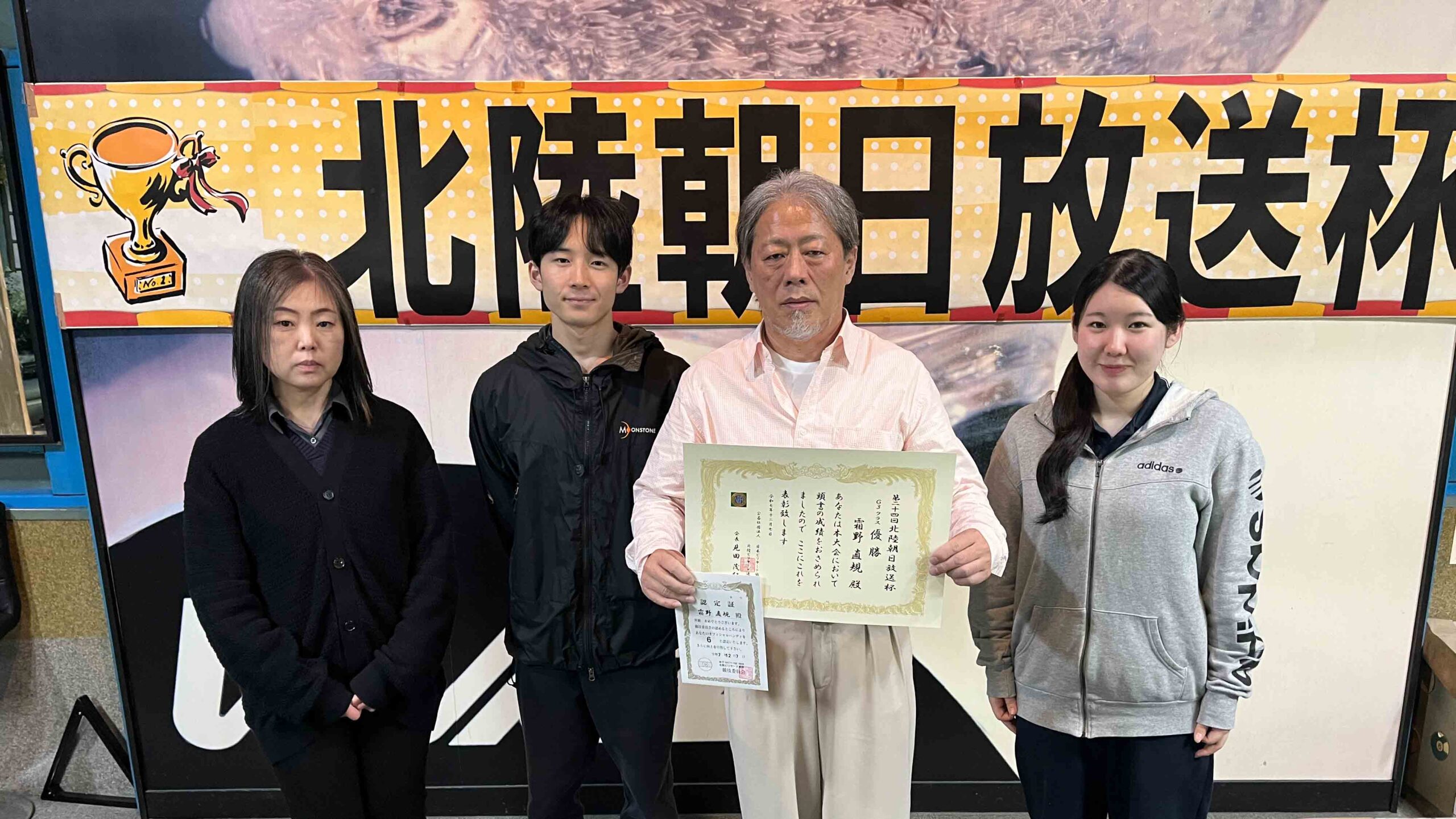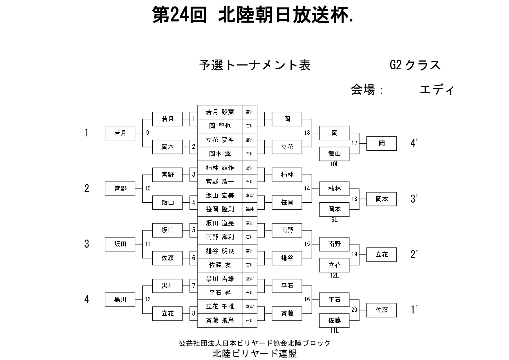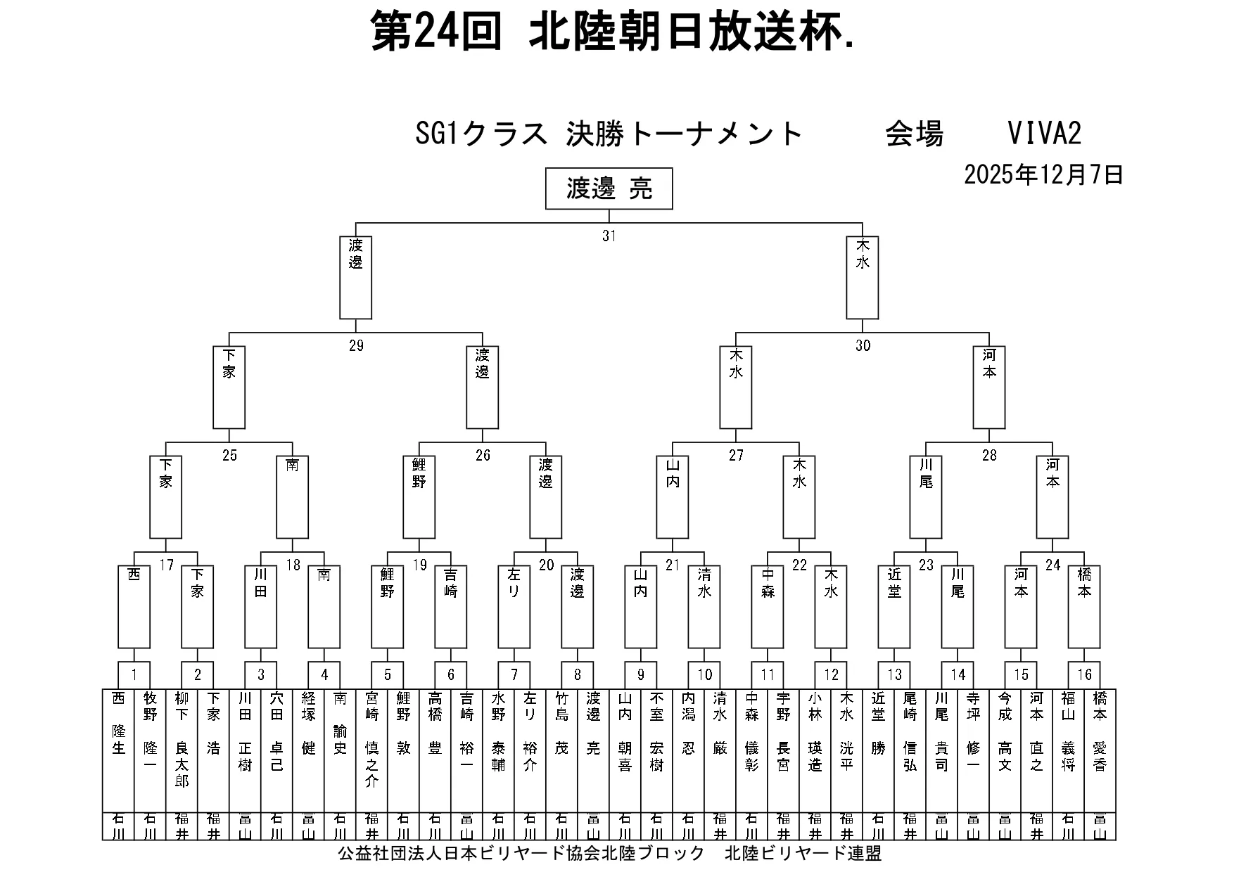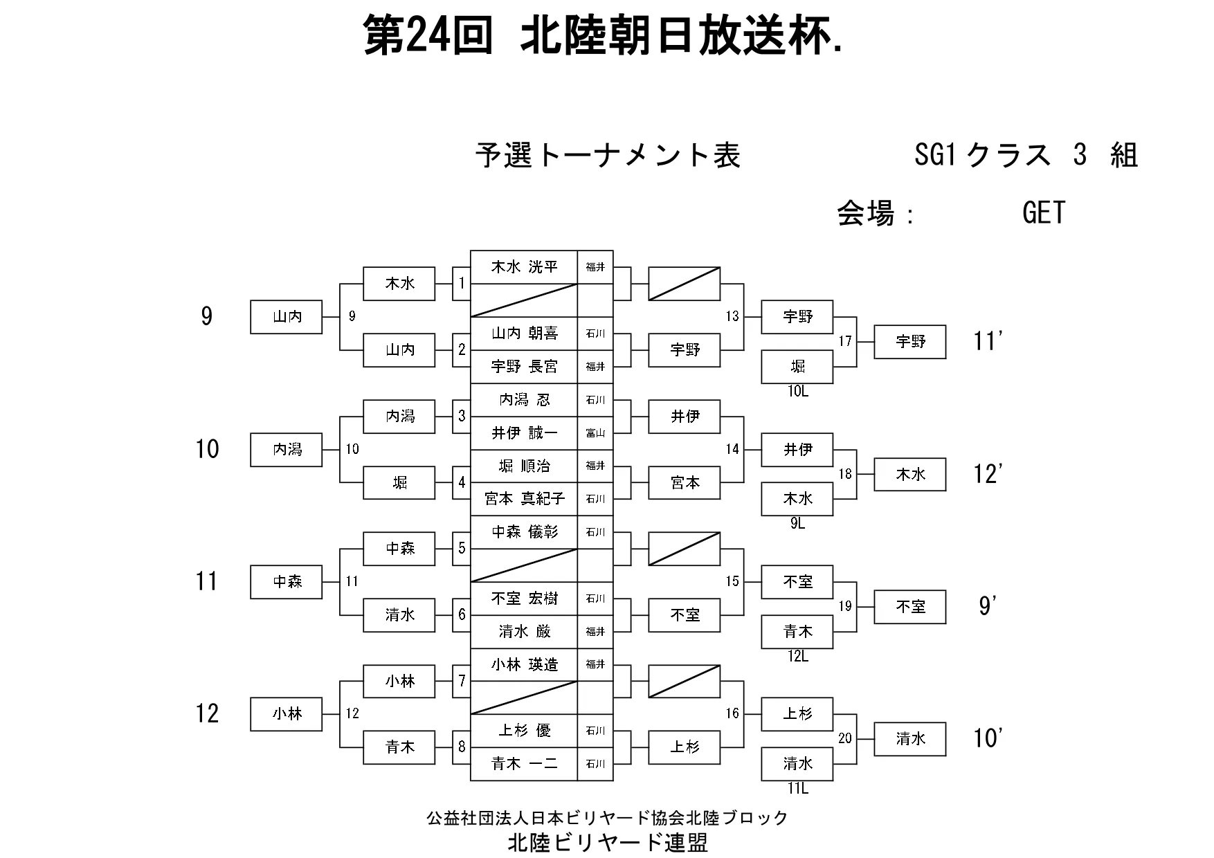 第24回北陸朝日放送杯 試合結果 2025.12.07 S クラス 優 勝田中 英治(石川)準優勝田中英貴(石川)3位タイ岡本 昌雄(富山)3位タイ壽時 敬(石川) SG1 クラス 優 勝渡邊 亮(富山)準優勝木水 洸平(福井)3位タイ河本 直之(福井)3位タイ下家 浩(福井) G1 クラス 優 勝田中 久一(福井) 準優勝谷口 義樹(福井)3位タイ小山 登(石川)3位タイ村本 健(石川) G2 クラス 優 勝若月 駿寛(富山)準優勝黒川 吉雄(富山)3位タイ岡本 翼(石川)3位タイ立花 千雅(富山) G3 クラス 優 勝霜野 直規(富山) 準優勝尾崎 智美(福井) 3位タイ山澤 裕香里 (富山)3位タイ奥村 蓮 (富山) G4 クラス 優 勝青山 央(富山)準優勝木本 皐輝(富山) 3位タイ田口 大惺(石川)3位タイ岩田 拓人(富山)