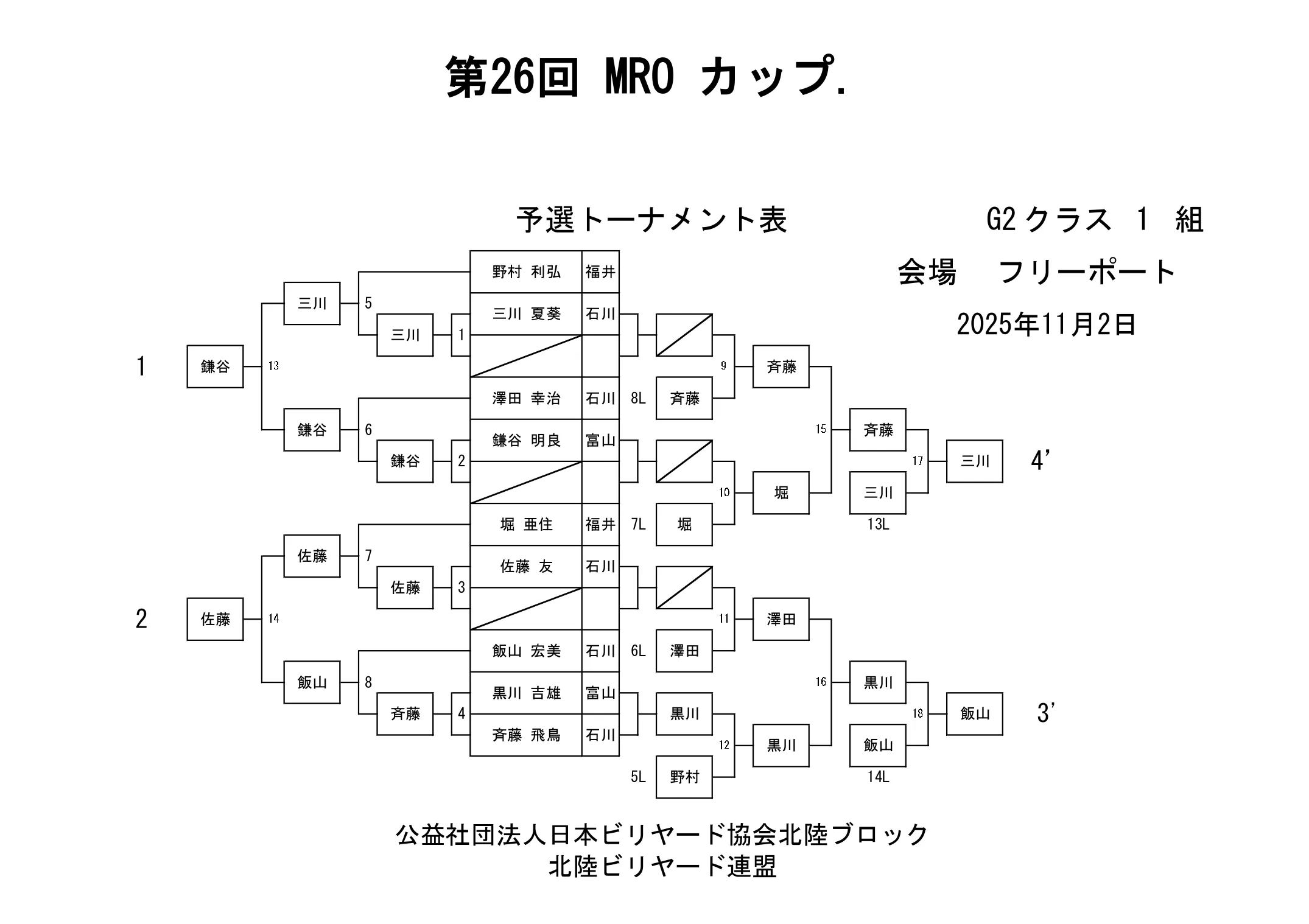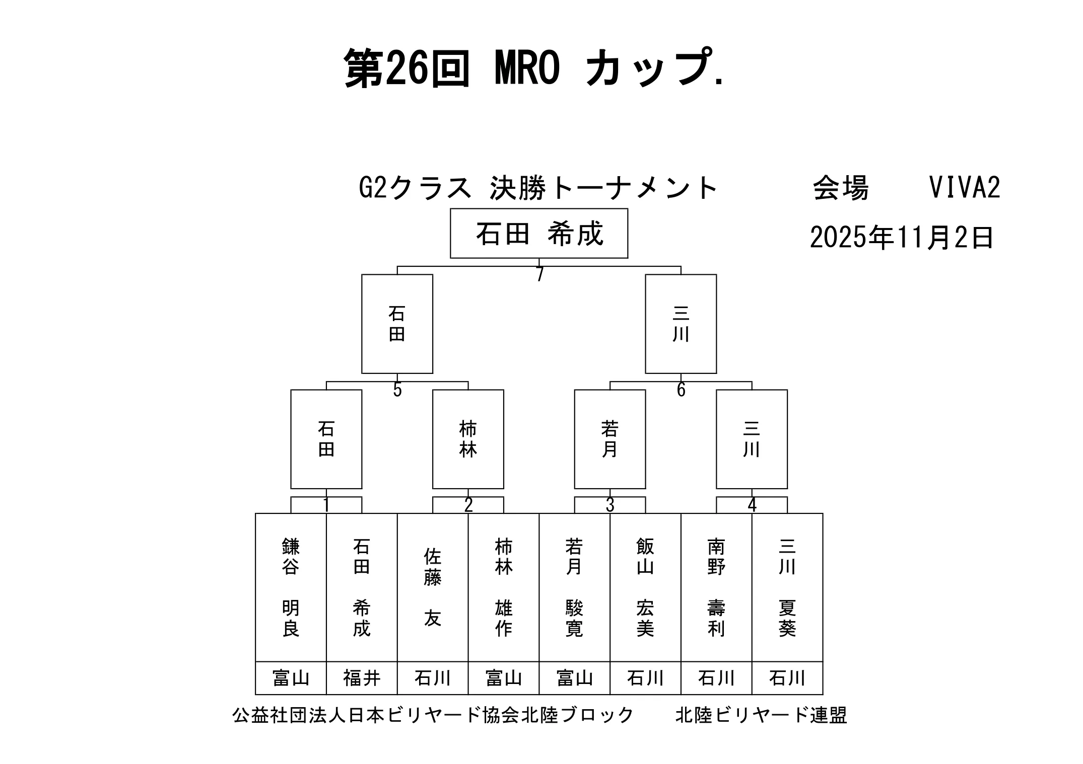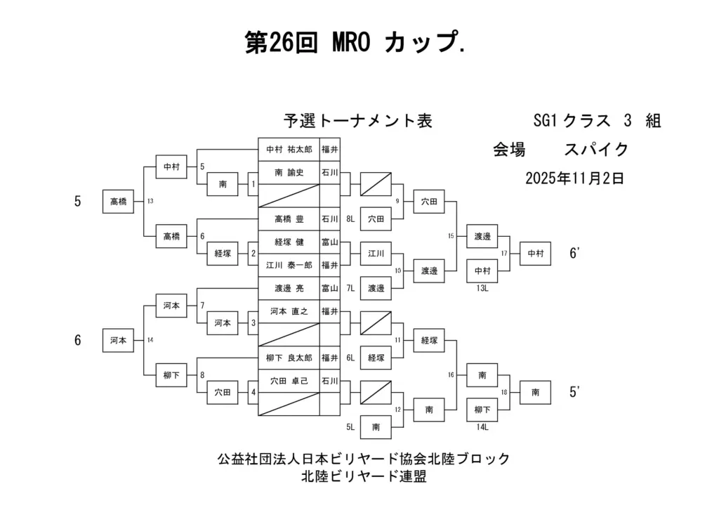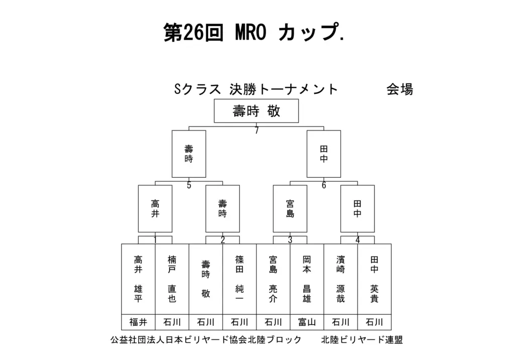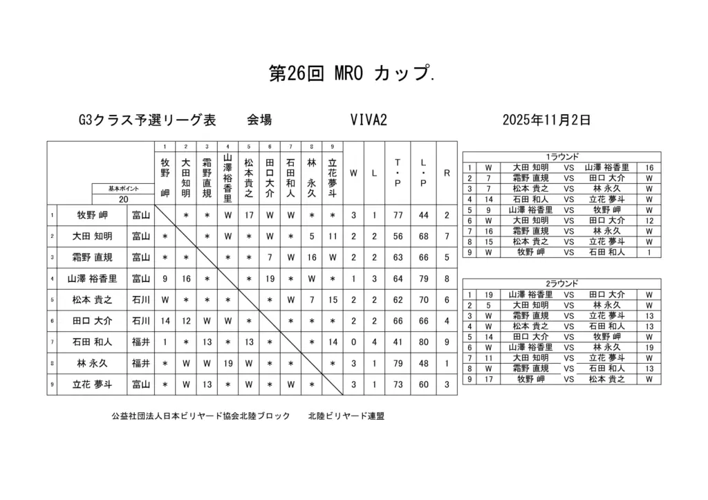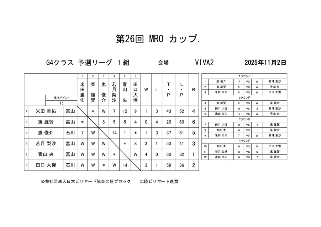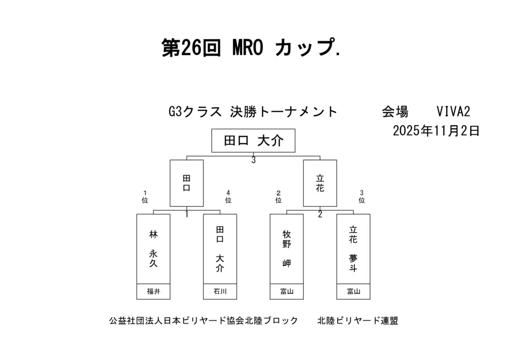 第26回MROカップ 試合結果 2025.11.03 S クラス 優 勝壽時 敬(石川)準優勝田中英貴(石川)3位タイ高井 雄平(福井)3位タイ宮島 亮介(石川) SG1 クラス 優 勝中村 祐太郎(福井)準優勝坪田 大成(福井)3位タイ福山 義将(石川)3位タイ中山 佳之(福井) G1 クラス 優 勝フランコ ラファエル(富山) 準優勝小山 登(石川)3位タイレダンヴィエット(富山)3位タイ須藤 幸洋(富山) G2 クラス 優 勝石田 希成(福井)準優勝三川 夏葵(石川)3位タイ柿林 雄作(富山)3位タイ若月 駿寛(富山) G3 クラス 優 勝田口 大介(石川)準優勝立花 夢斗(富山) 3位タイ牧野 岬(富山) 3位タイ林 永久(福井) G4 クラス 優 勝奥村 蓮(富山)準優勝木太入沢 雄一(富山) 3位タイ青山 央(富山)3位タイ田口 大惺(石川)