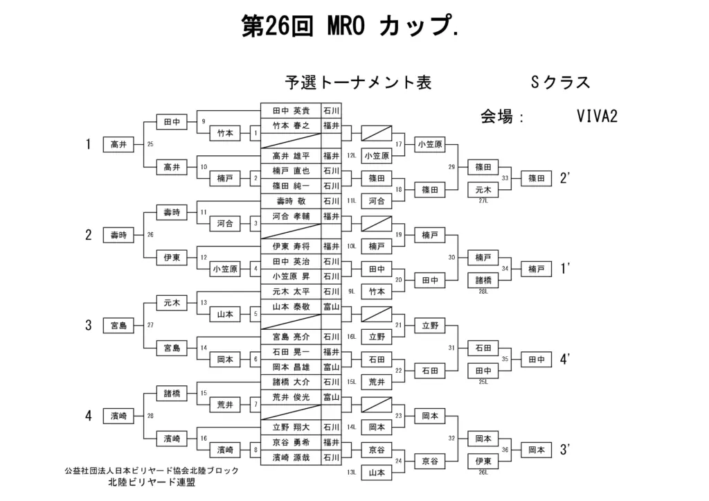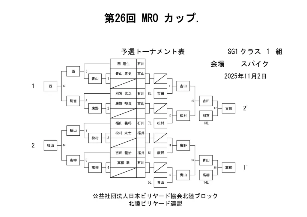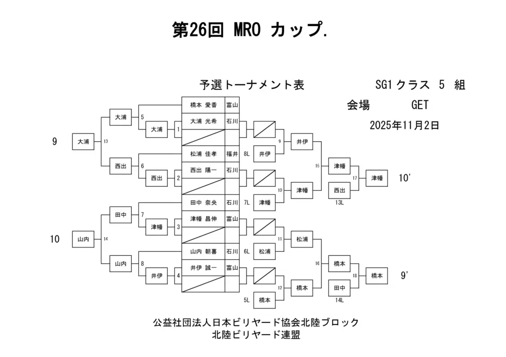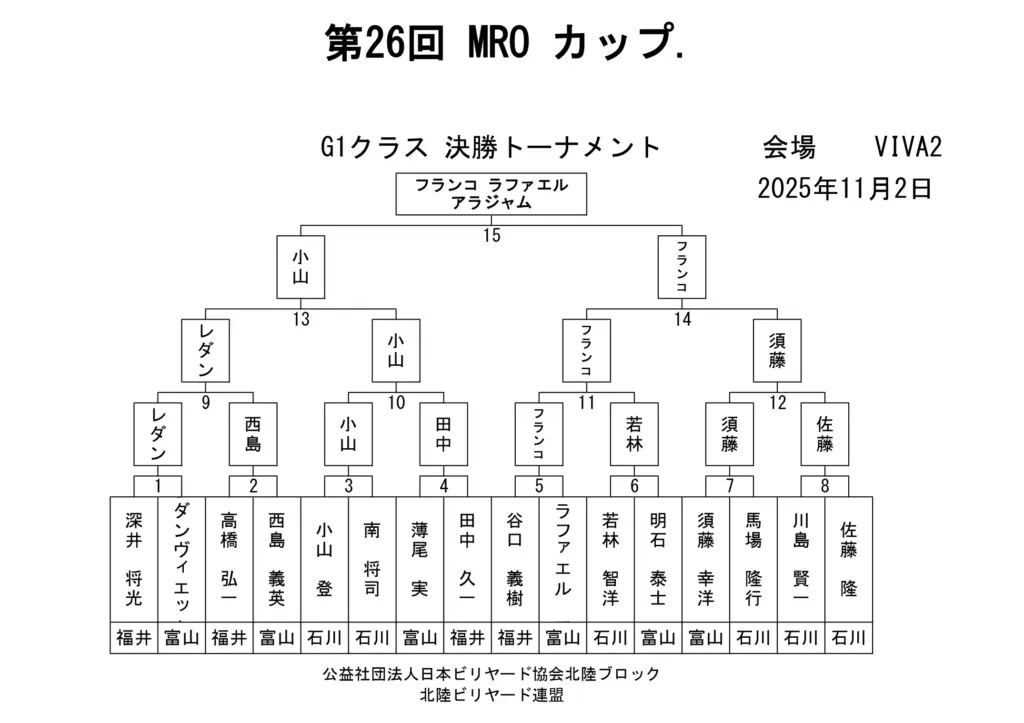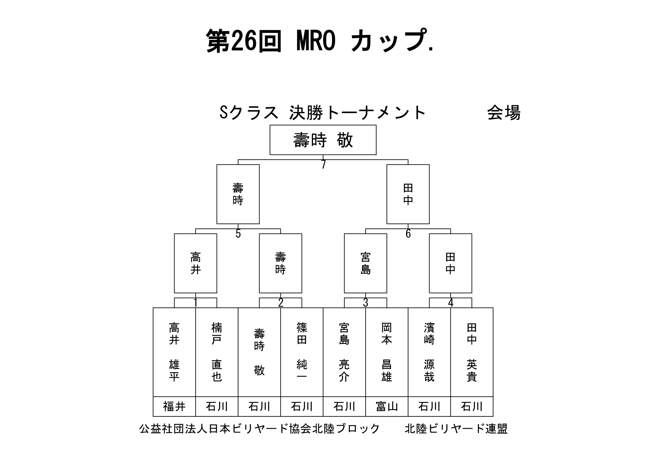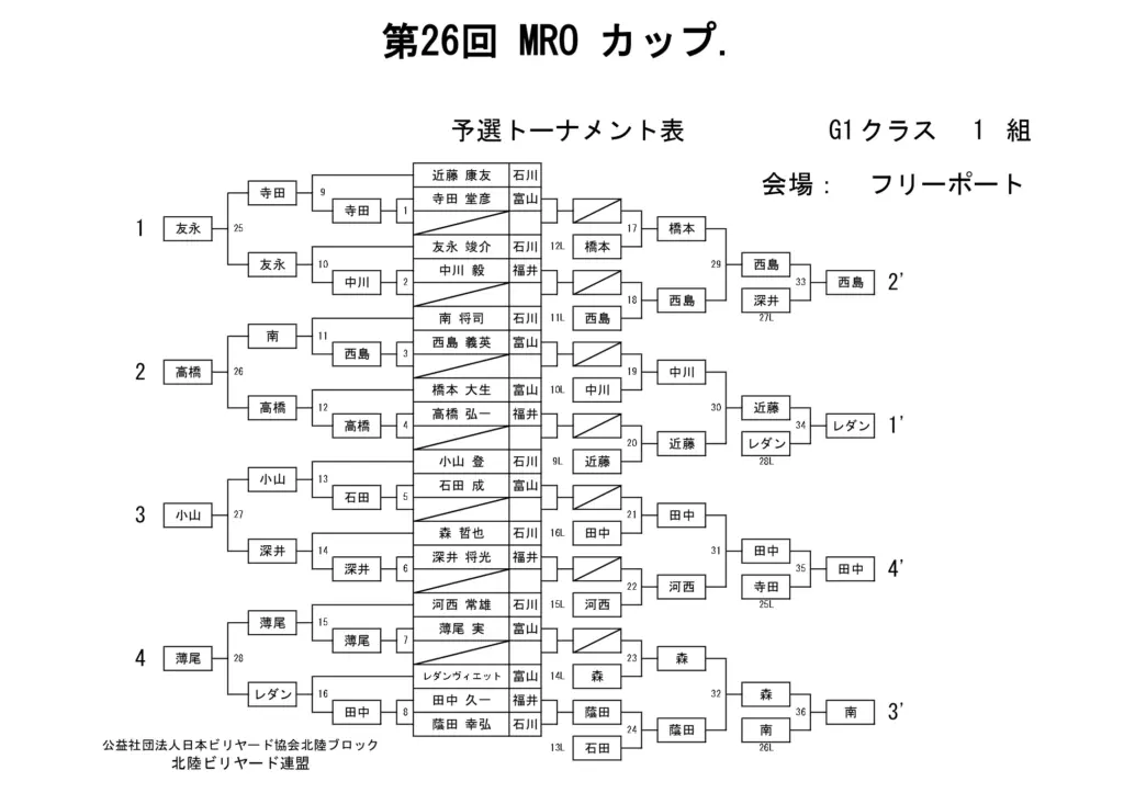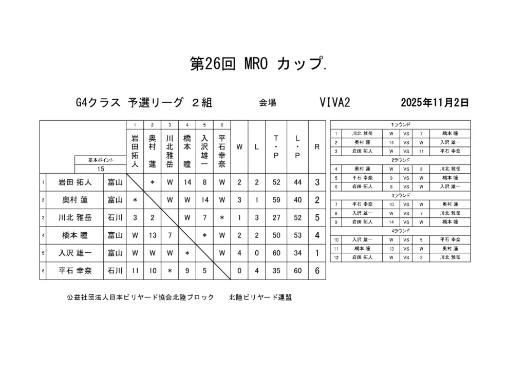 第26回MROカップ 試合結果 2025.11.03 S クラス 優 勝壽時 敬(石川)準優勝田中英貴(石川)3位タイ高井 雄平(福井)3位タイ宮島 亮介(石川) SG1 クラス 優 勝中村 祐太郎(福井)準優勝坪田 大成(福井)3位タイ福山 義将(石川)3位タイ中山 佳之(福井) G1 クラス 優 勝フランコ ラファエル(富山) 準優勝小山 登(石川)3位タイレダンヴィエット(富山)3位タイ須藤 幸洋(富山) G2 クラス 優 勝石田 希成(福井)準優勝三川 夏葵(石川)3位タイ柿林 雄作(富山)3位タイ若月 駿寛(富山) G3 クラス 優 勝田口 大介(石川)準優勝立花 夢斗(富山) 3位タイ牧野 岬(富山) 3位タイ林 永久(福井) G4 クラス 優 勝奥村 蓮(富山)準優勝木太入沢 雄一(富山) 3位タイ青山 央(富山)3位タイ田口 大惺(石川)