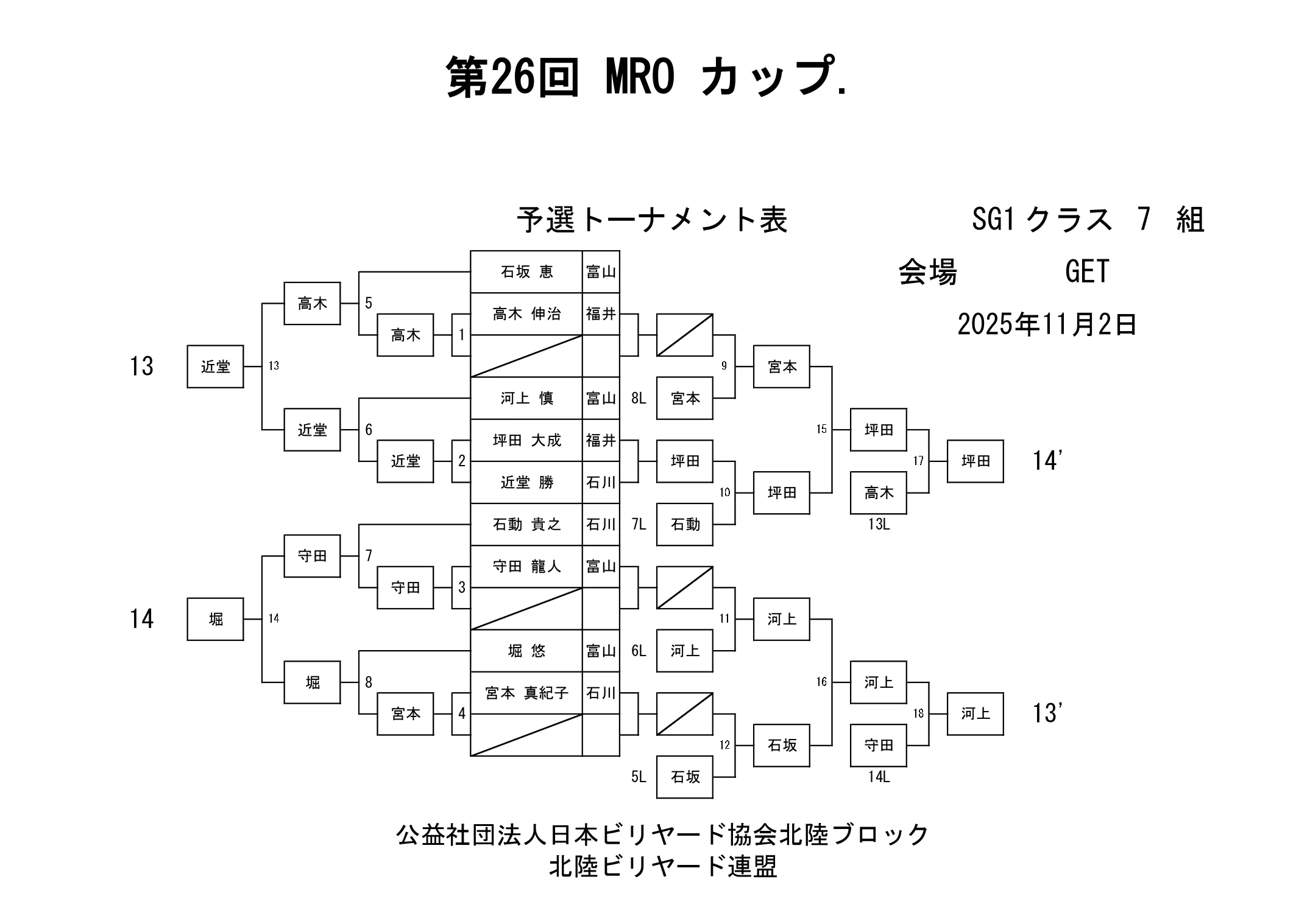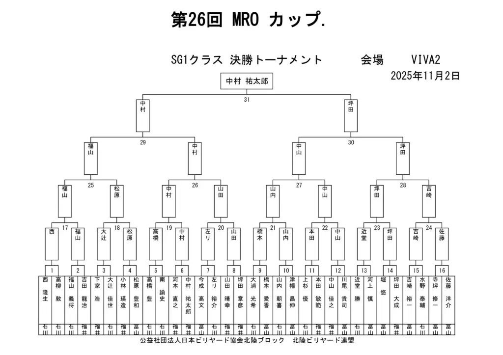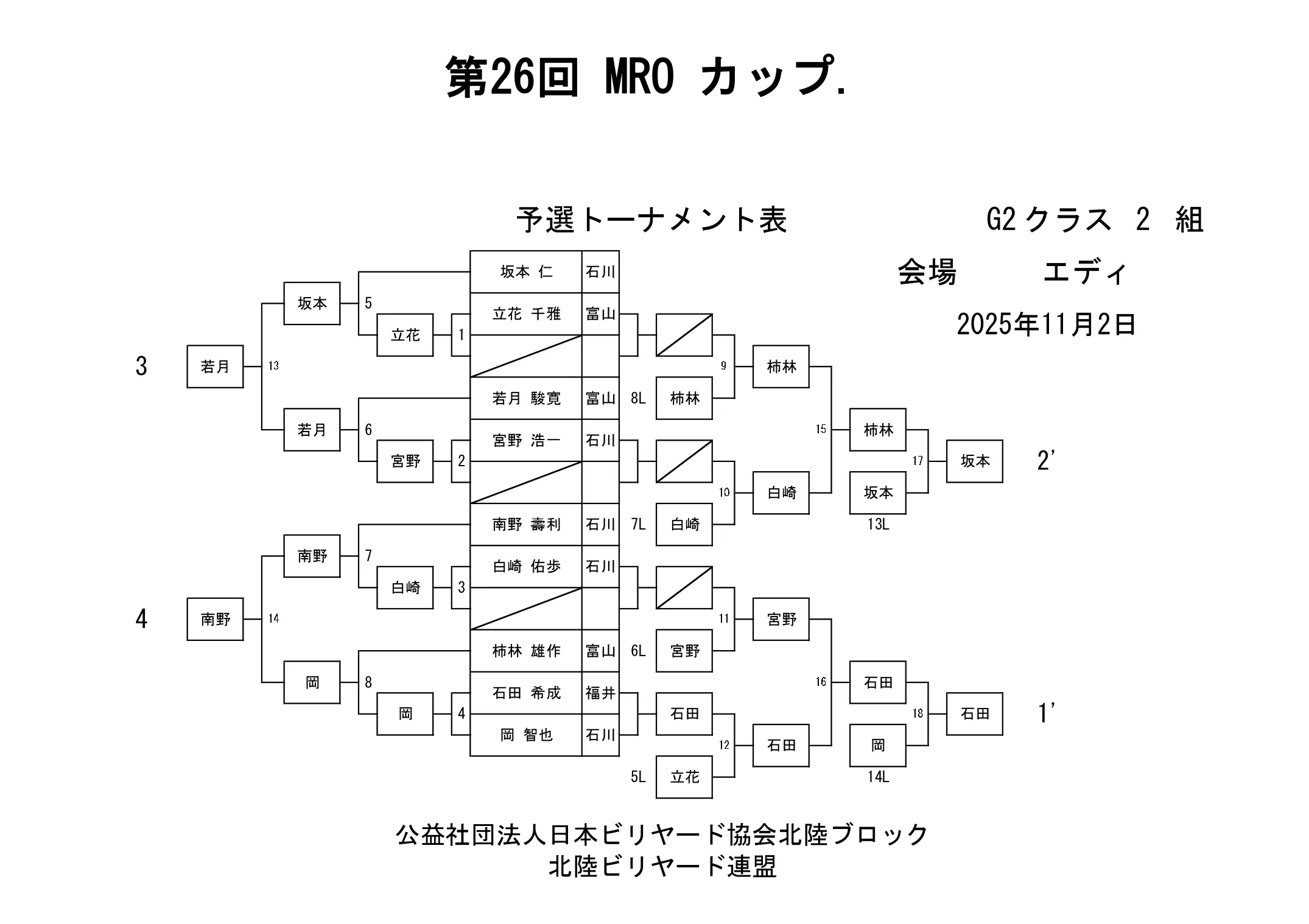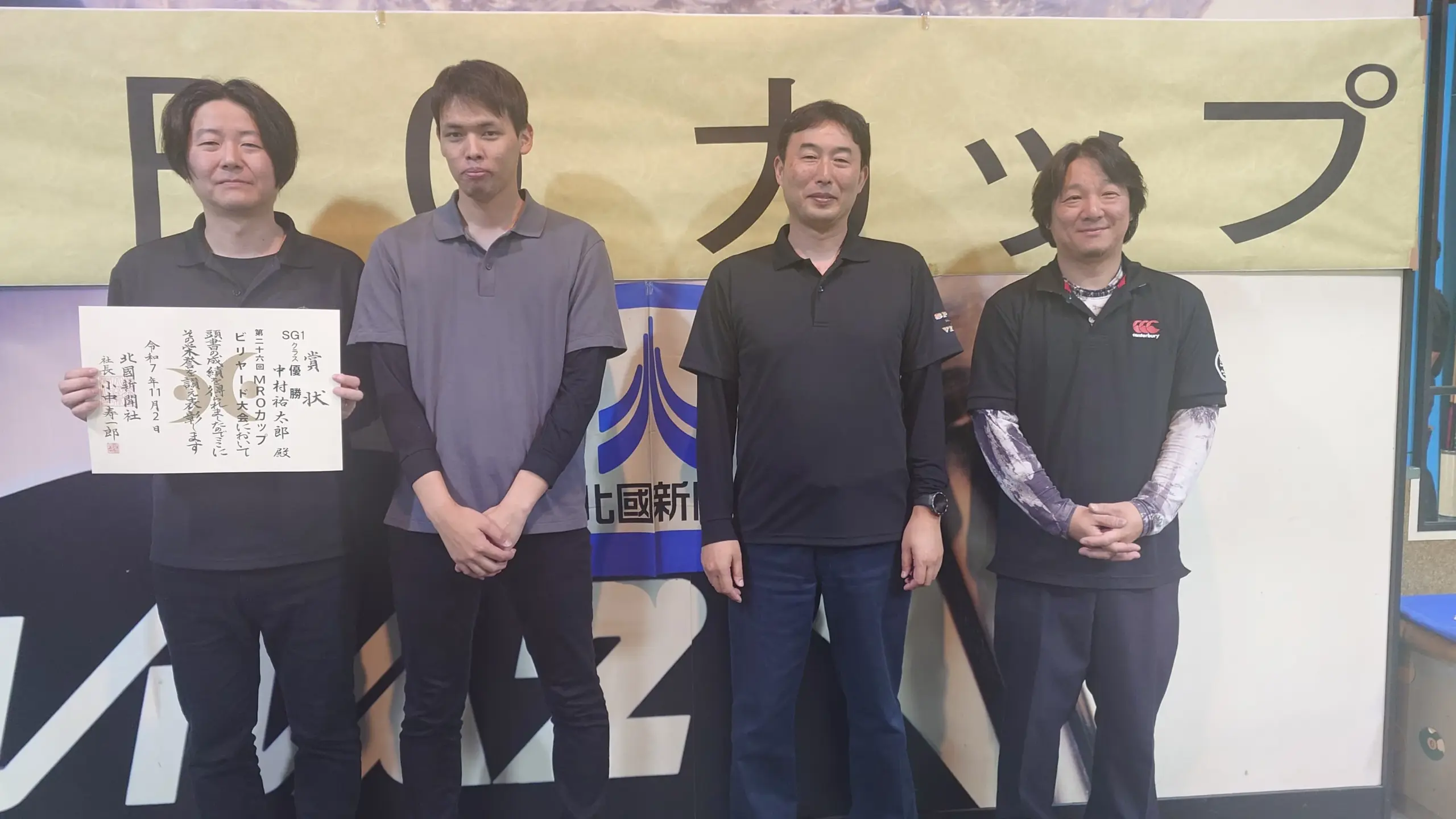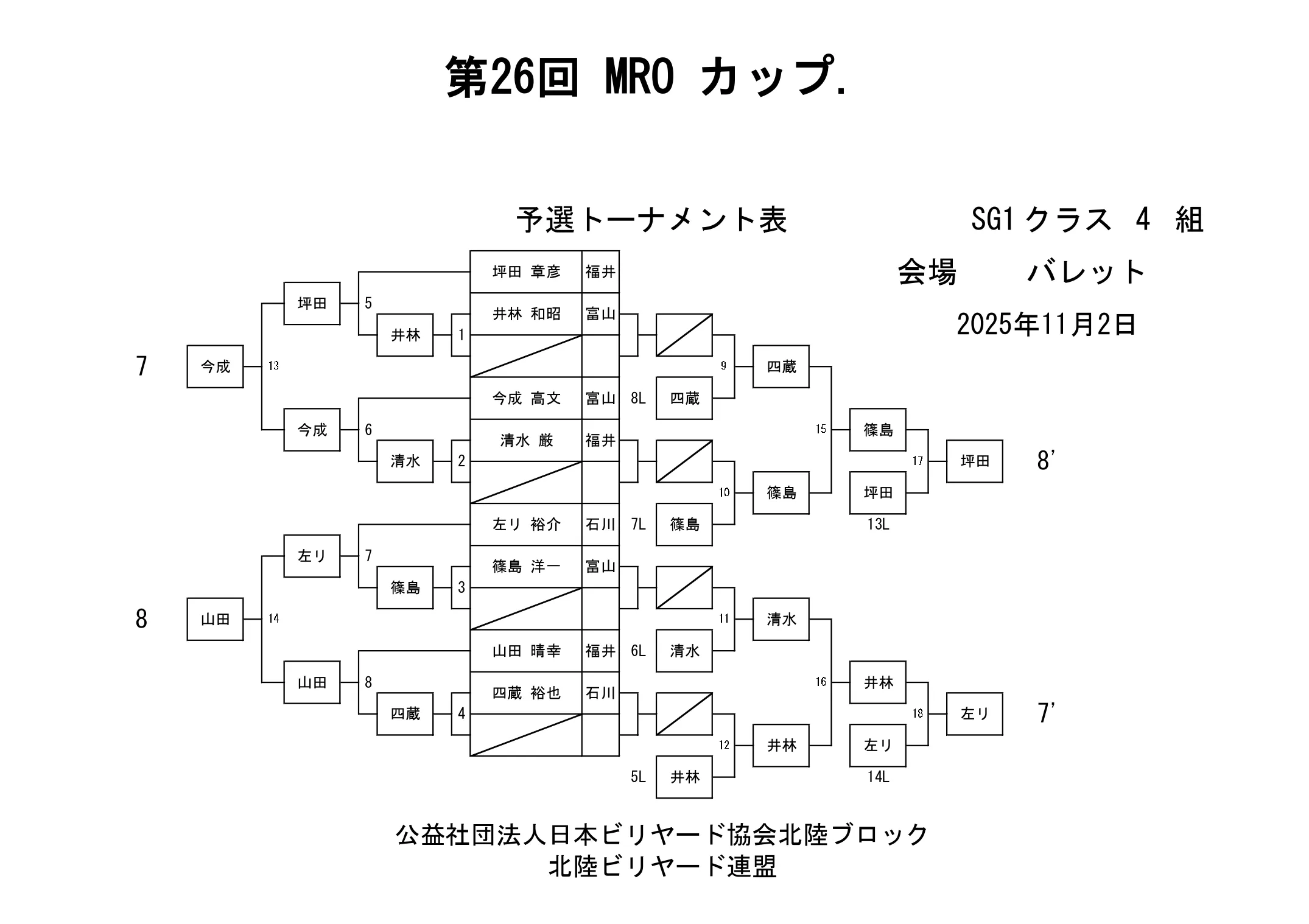 第26回MROカップ 試合結果 2025.11.03 S クラス 優 勝壽時 敬(石川)準優勝田中英貴(石川)3位タイ高井 雄平(福井)3位タイ宮島 亮介(石川) SG1 クラス 優 勝中村 祐太郎(福井)準優勝坪田 大成(福井)3位タイ福山 義将(石川)3位タイ中山 佳之(福井) G1 クラス 優 勝フランコ ラファエル(富山) 準優勝小山 登(石川)3位タイレダンヴィエット(富山)3位タイ須藤 幸洋(富山) G2 クラス 優 勝石田 希成(福井)準優勝三川 夏葵(石川)3位タイ柿林 雄作(富山)3位タイ若月 駿寛(富山) G3 クラス 優 勝田口 大介(石川)準優勝立花 夢斗(富山) 3位タイ牧野 岬(富山) 3位タイ林 永久(福井) G4 クラス 優 勝奥村 蓮(富山)準優勝木太入沢 雄一(富山) 3位タイ青山 央(富山)3位タイ田口 大惺(石川)