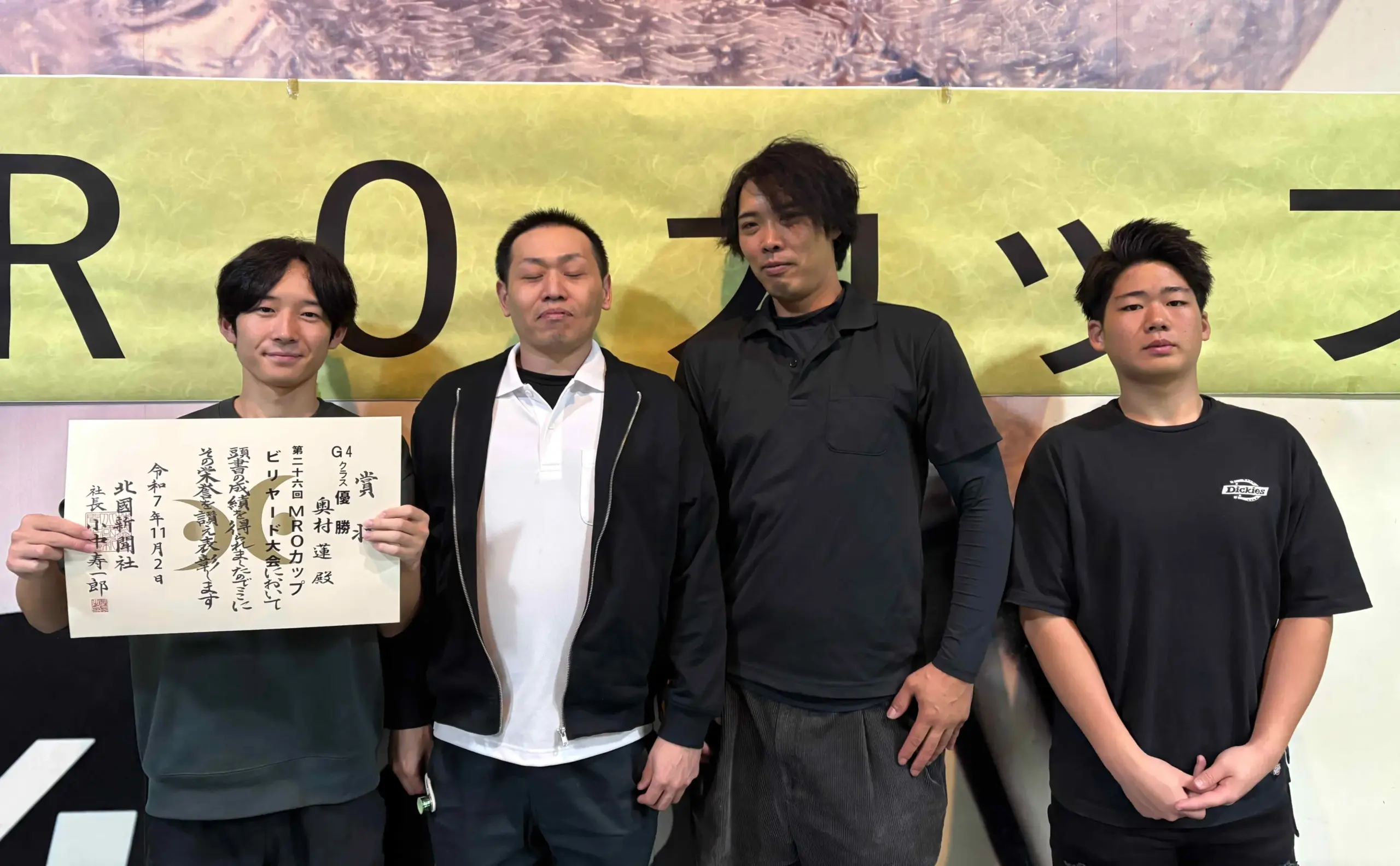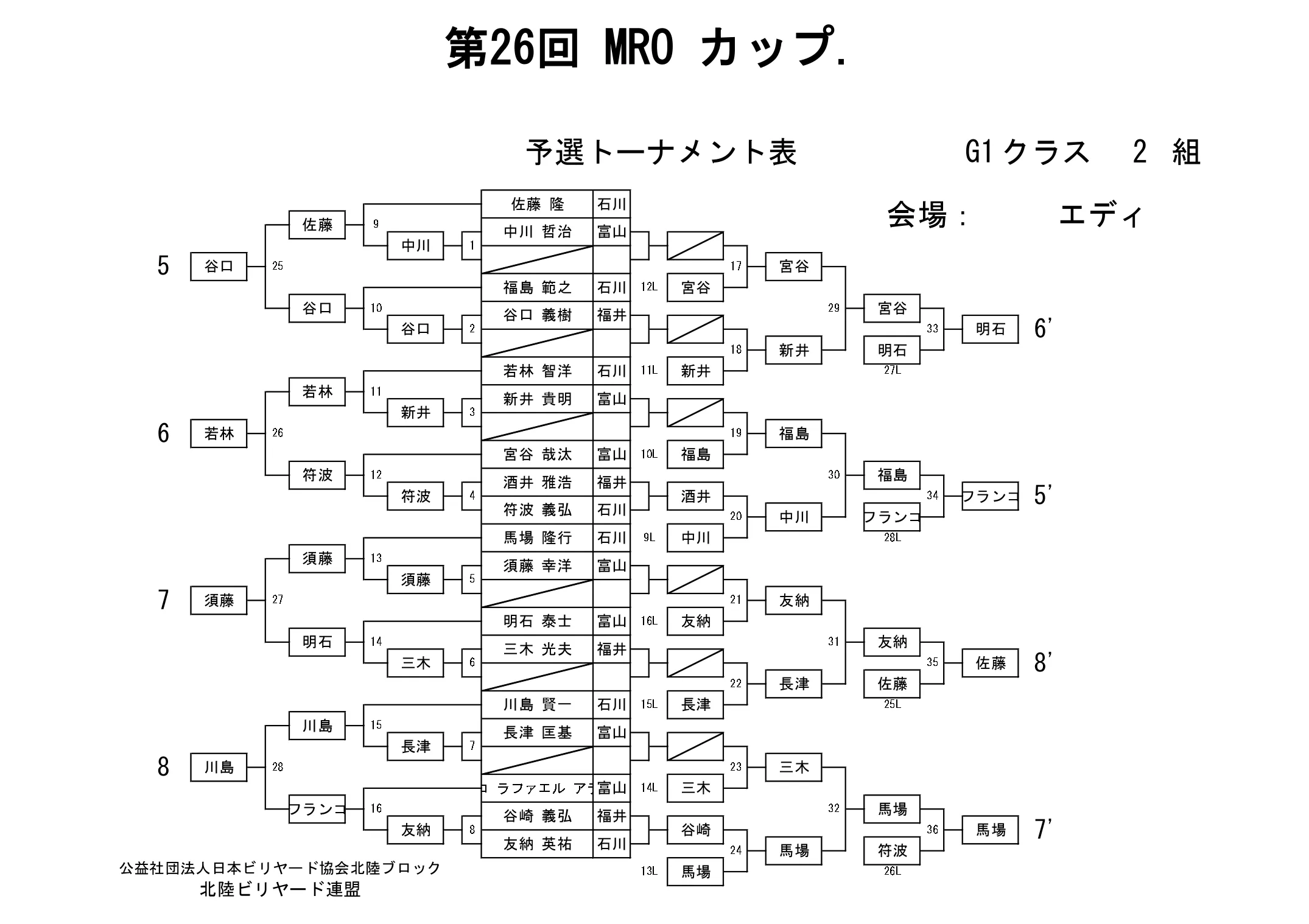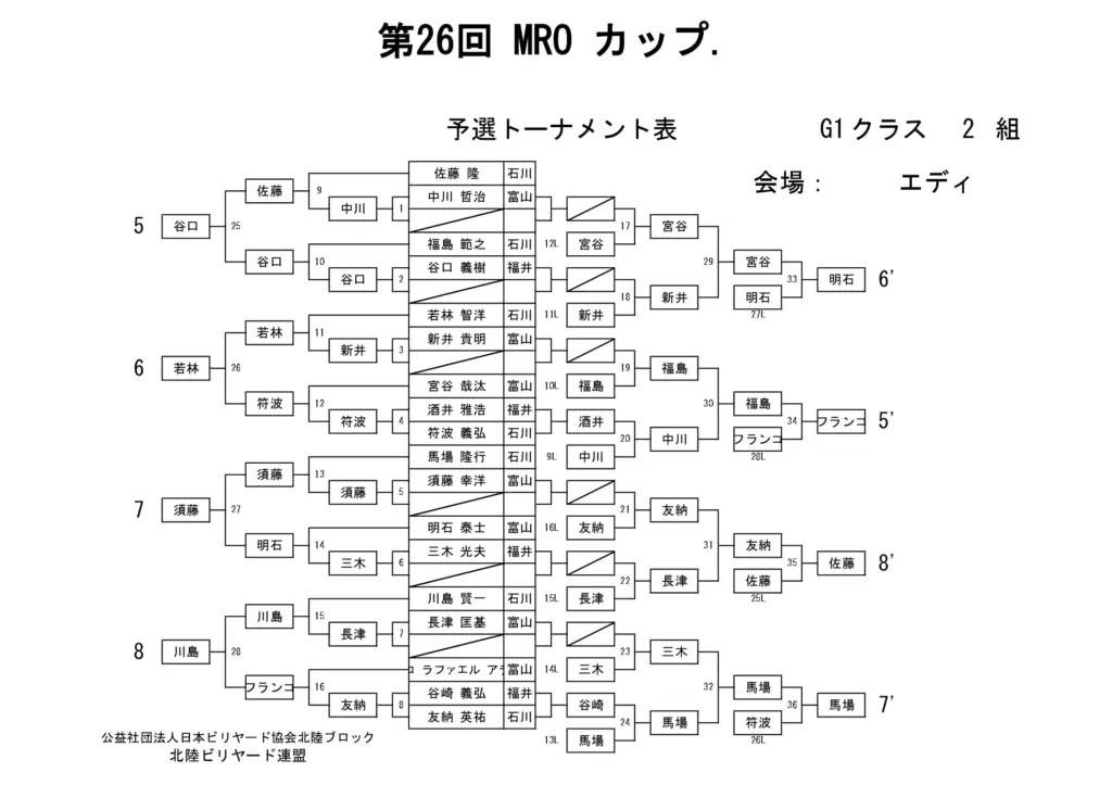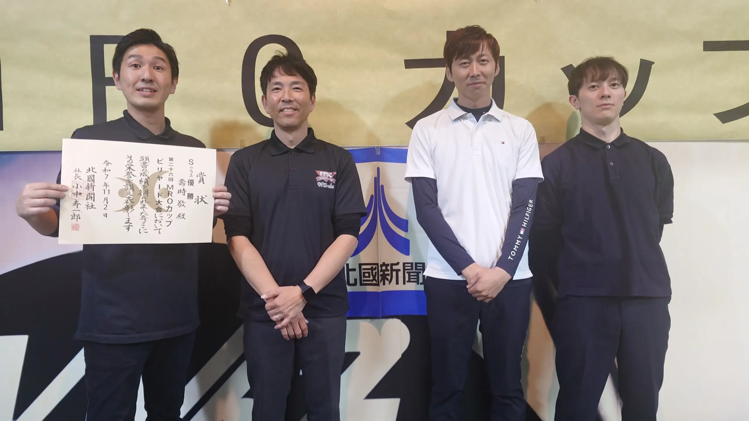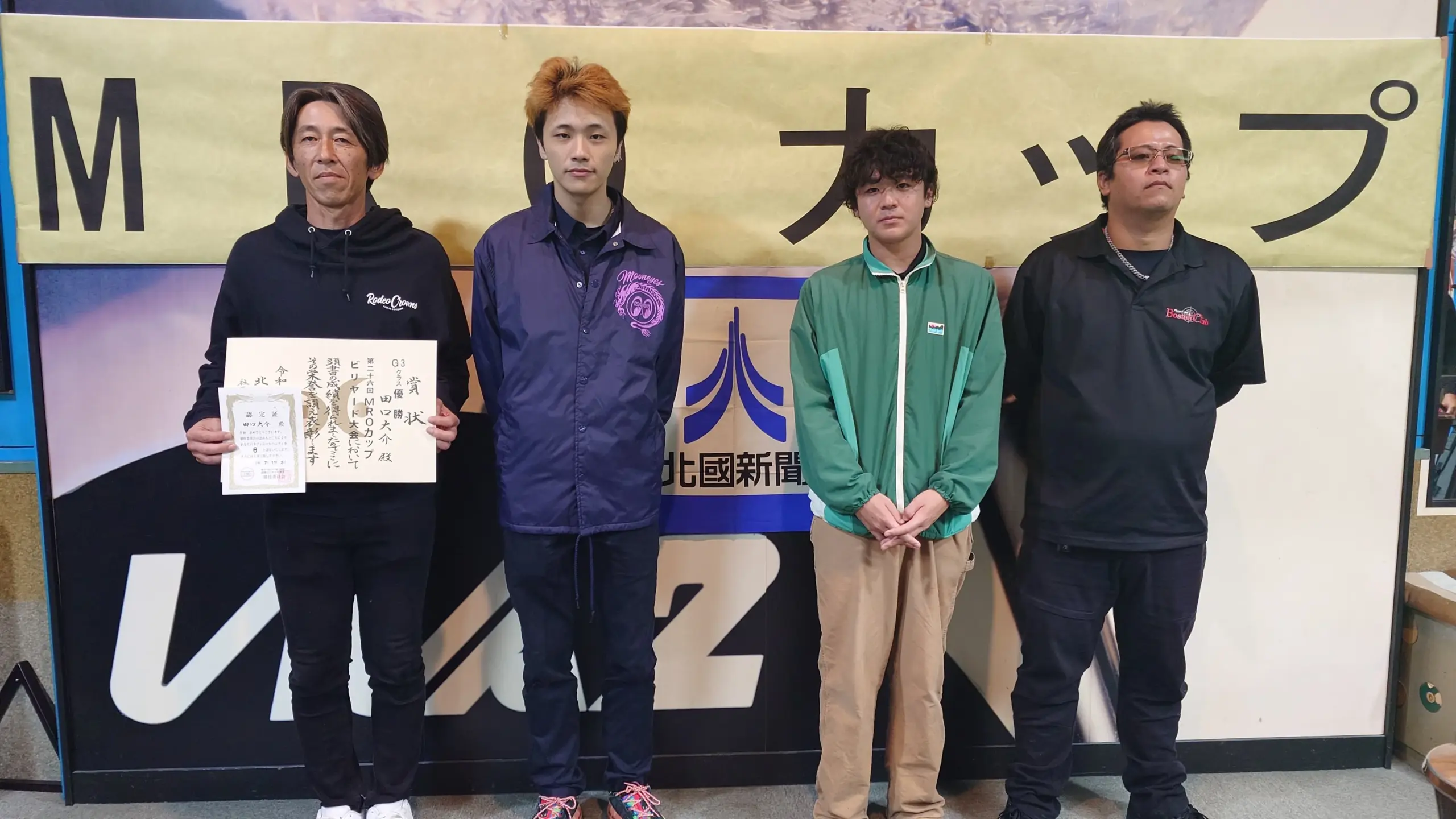 第26回MROカップ 試合結果 2025.11.03 S クラス 優 勝壽時 敬(石川)準優勝田中英貴(石川)3位タイ高井 雄平(福井)3位タイ宮島 亮介(石川) SG1 クラス 優 勝中村 祐太郎(福井)準優勝坪田 大成(福井)3位タイ福山 義将(石川)3位タイ中山 佳之(福井) G1 クラス 優 勝フランコ ラファエル(富山) 準優勝小山 登(石川)3位タイレダンヴィエット(富山)3位タイ須藤 幸洋(富山) G2 クラス 優 勝石田 希成(福井)準優勝三川 夏葵(石川)3位タイ柿林 雄作(富山)3位タイ若月 駿寛(富山) G3 クラス 優 勝田口 大介(石川)準優勝立花 夢斗(富山) 3位タイ牧野 岬(富山) 3位タイ林 永久(福井) G4 クラス 優 勝奥村 蓮(富山)準優勝木太入沢 雄一(富山) 3位タイ青山 央(富山)3位タイ田口 大惺(石川)
