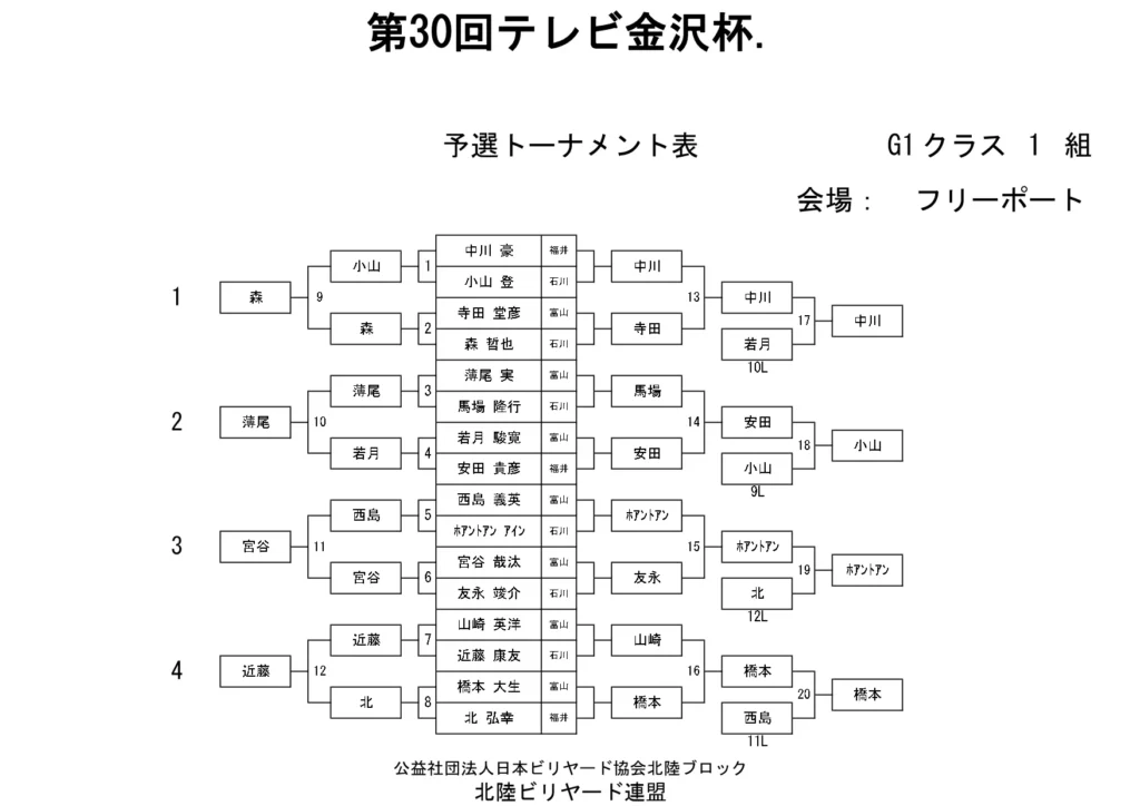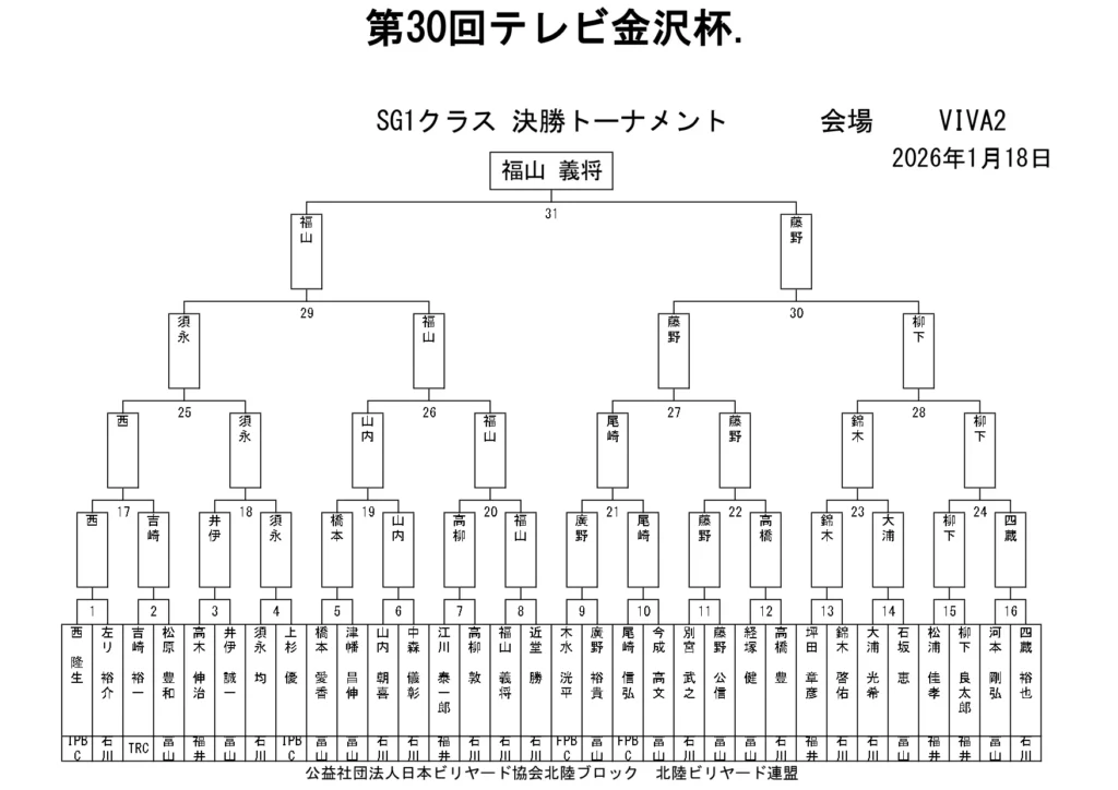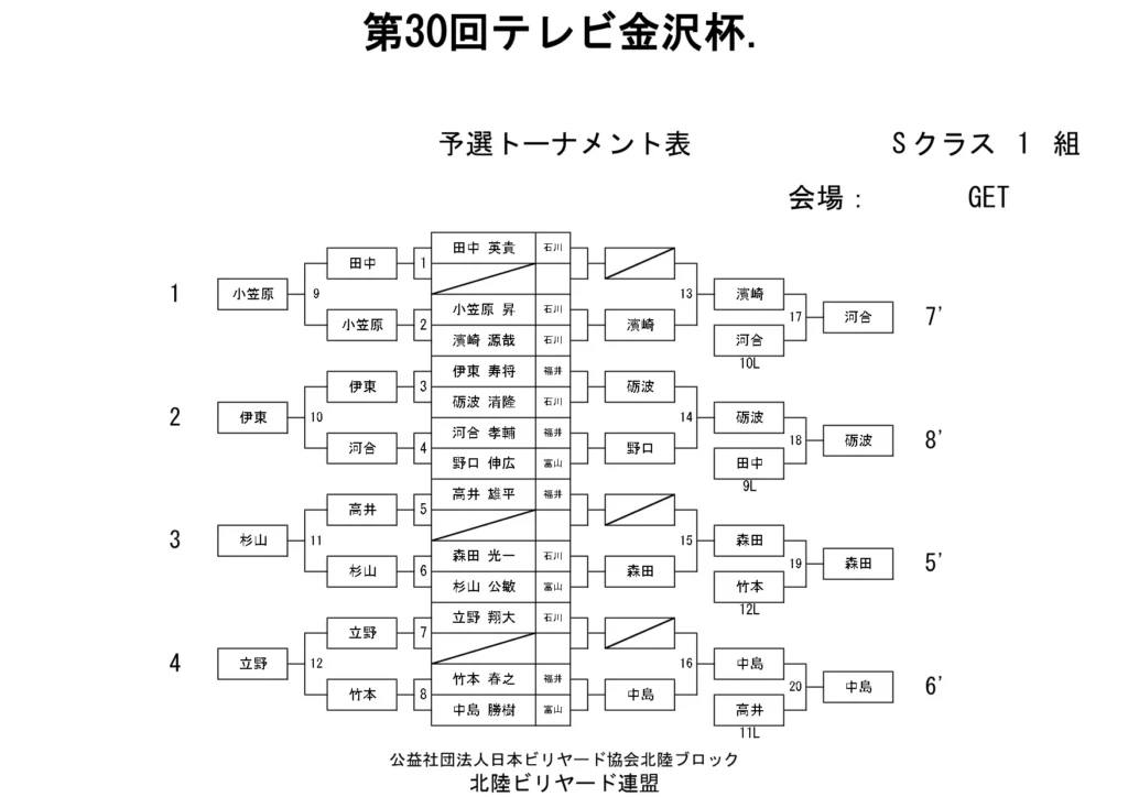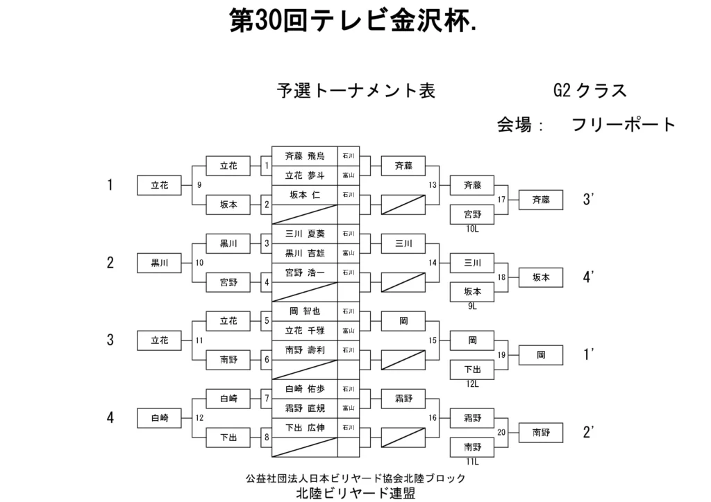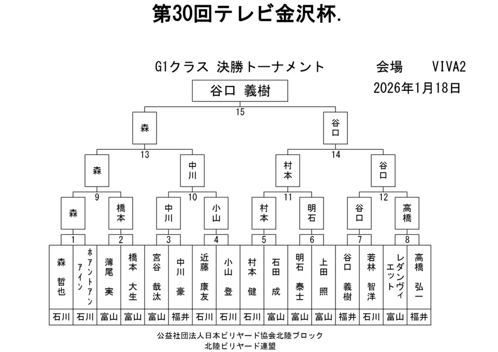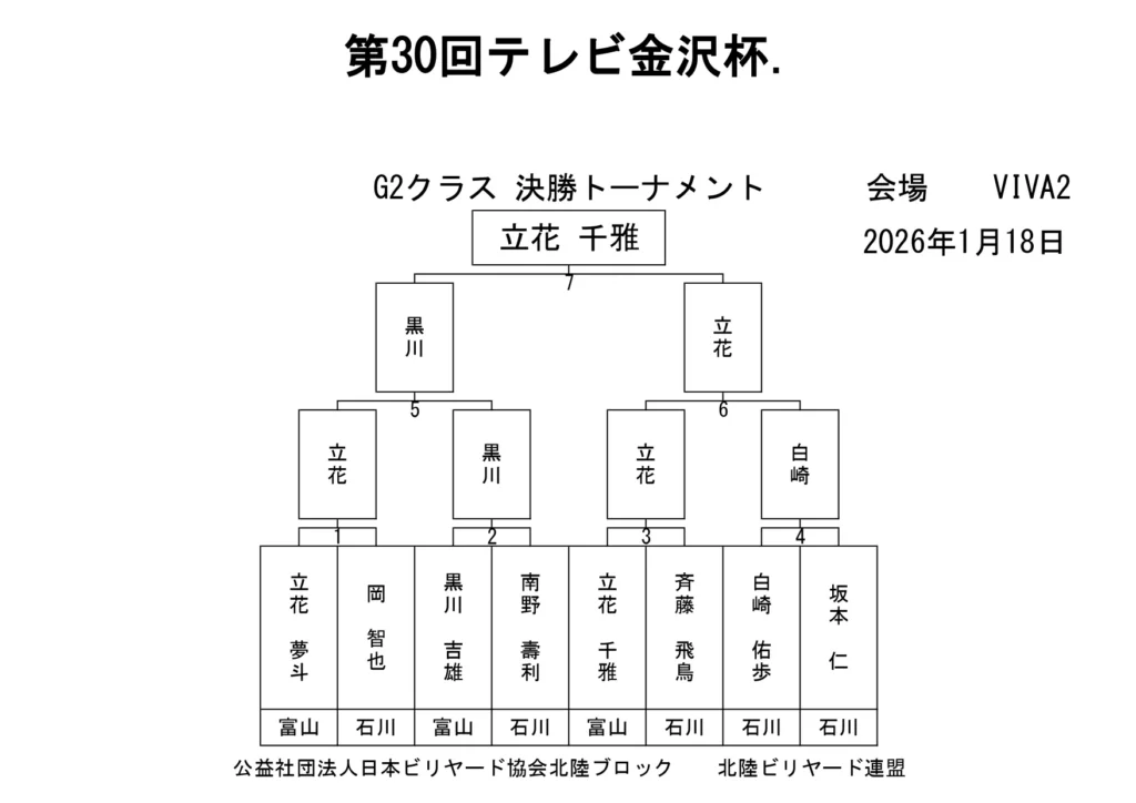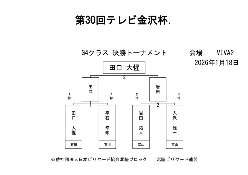第30回テレビ金沢杯 試合結果 2026.01.19 Sクラス 優 勝山本 泰敬(TRC)準優勝河合 孝輔(FPBC)3位タイ楠戸 直也(石川)3位タイ立野 翔大(石川) SG1クラス 優 勝福山 義将(石川)準優勝藤野 公信(富山)3位タイ柳下 良太郎(福井)3位タイ須永 均(石川) G1クラス 優 勝谷口 義樹(福井)準優勝森 哲也(石川)3位タイ村本 健(石川)3位タイ中川 豪(福井) G2クラス 優 勝立花 千雅(富山)準優勝黒川 吉雄(富山)3位タイ立花 夢斗(富山)3位タイ白崎 佑歩(石川) G3クラス 優 勝奥村 蓮(富山)準優勝大田 知明(富山)3位山澤 裕香里(富山) G4クラス 優 勝田口 大惺(石川)準優勝岩田 拓人(富山)3位タイ平石 幸奈(石川)3位タイ入沢 雄一(富山)