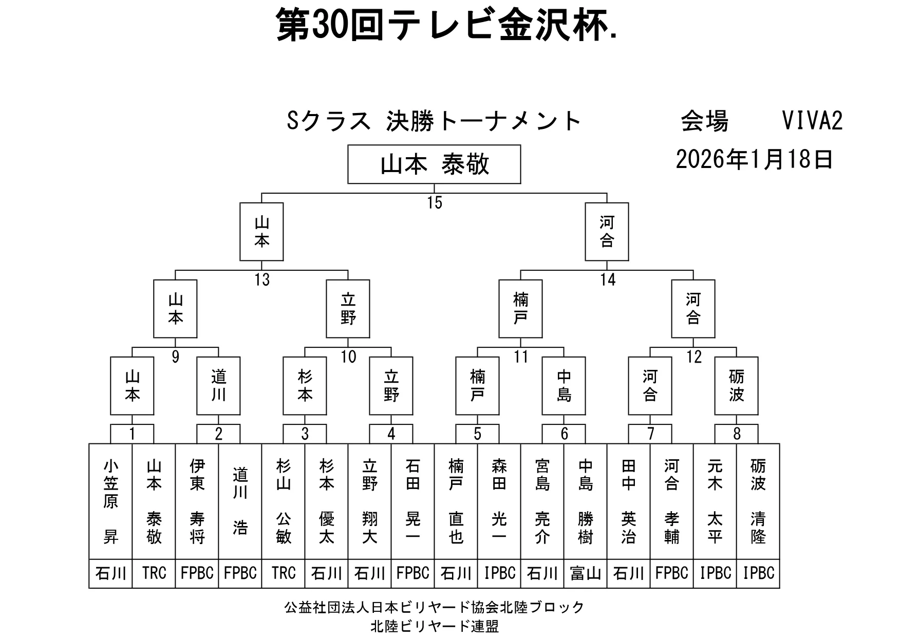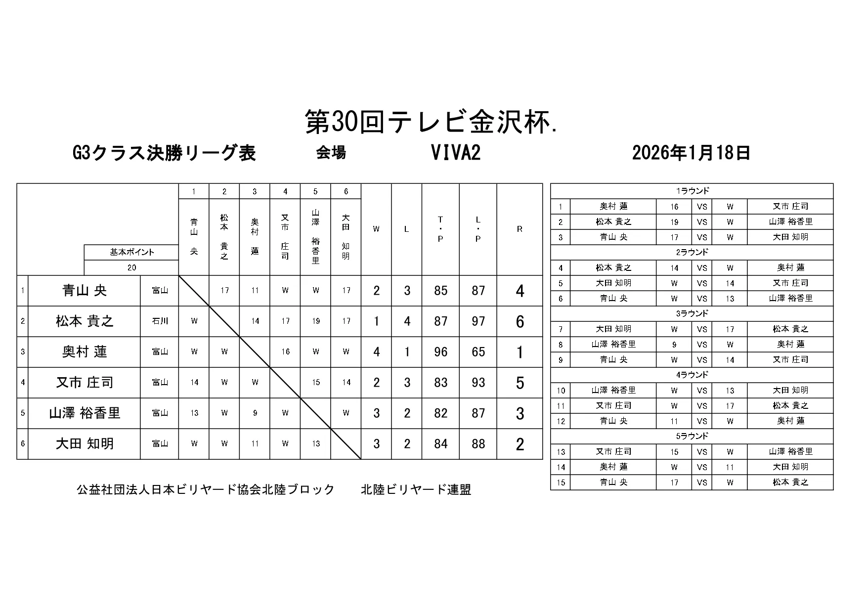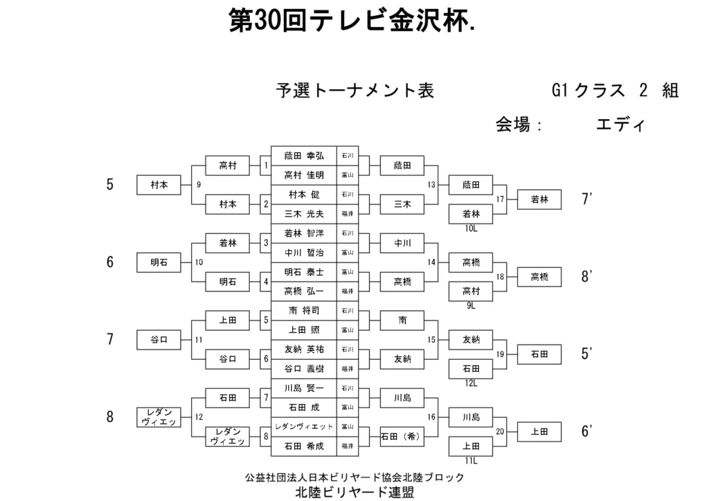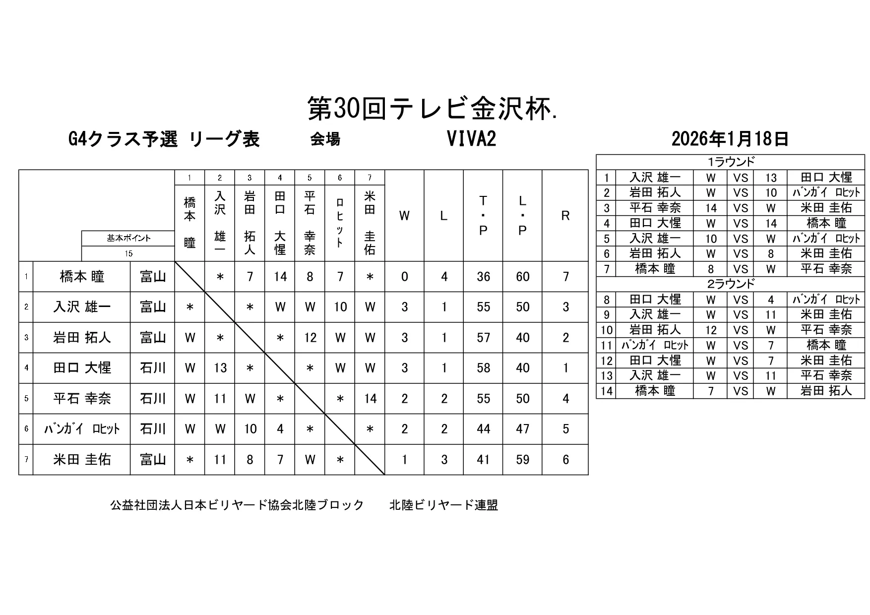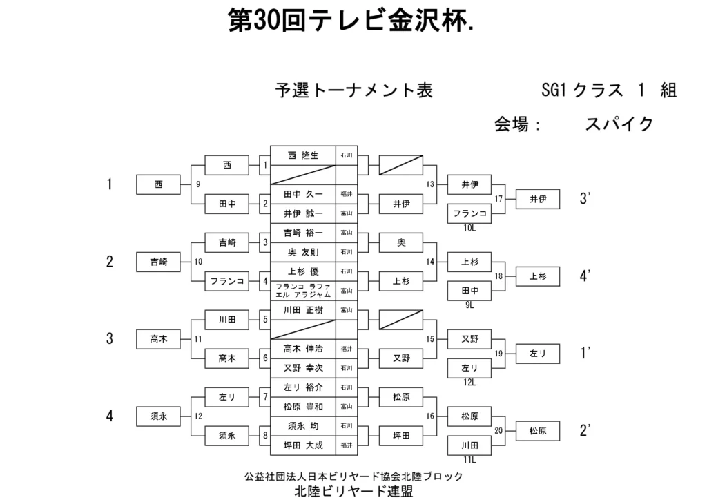 第30回テレビ金沢杯 試合結果 2026.01.19 Sクラス 優 勝山本 泰敬(TRC)準優勝河合 孝輔(FPBC)3位タイ楠戸 直也(石川)3位タイ立野 翔大(石川) SG1クラス 優 勝福山 義将(石川)準優勝藤野 公信(富山)3位タイ柳下 良太郎(福井)3位タイ須永 均(石川) G1クラス 優 勝谷口 義樹(福井)準優勝森 哲也(石川)3位タイ村本 健(石川)3位タイ中川 豪(福井) G2クラス 優 勝立花 千雅(富山)準優勝黒川 吉雄(富山)3位タイ立花 夢斗(富山)3位タイ白崎 佑歩(石川) G3クラス 優 勝奥村 蓮(富山)準優勝大田 知明(富山)3位山澤 裕香里(富山) G4クラス 優 勝田口 大惺(石川)準優勝岩田 拓人(富山)3位タイ平石 幸奈(石川)3位タイ入沢 雄一(富山)