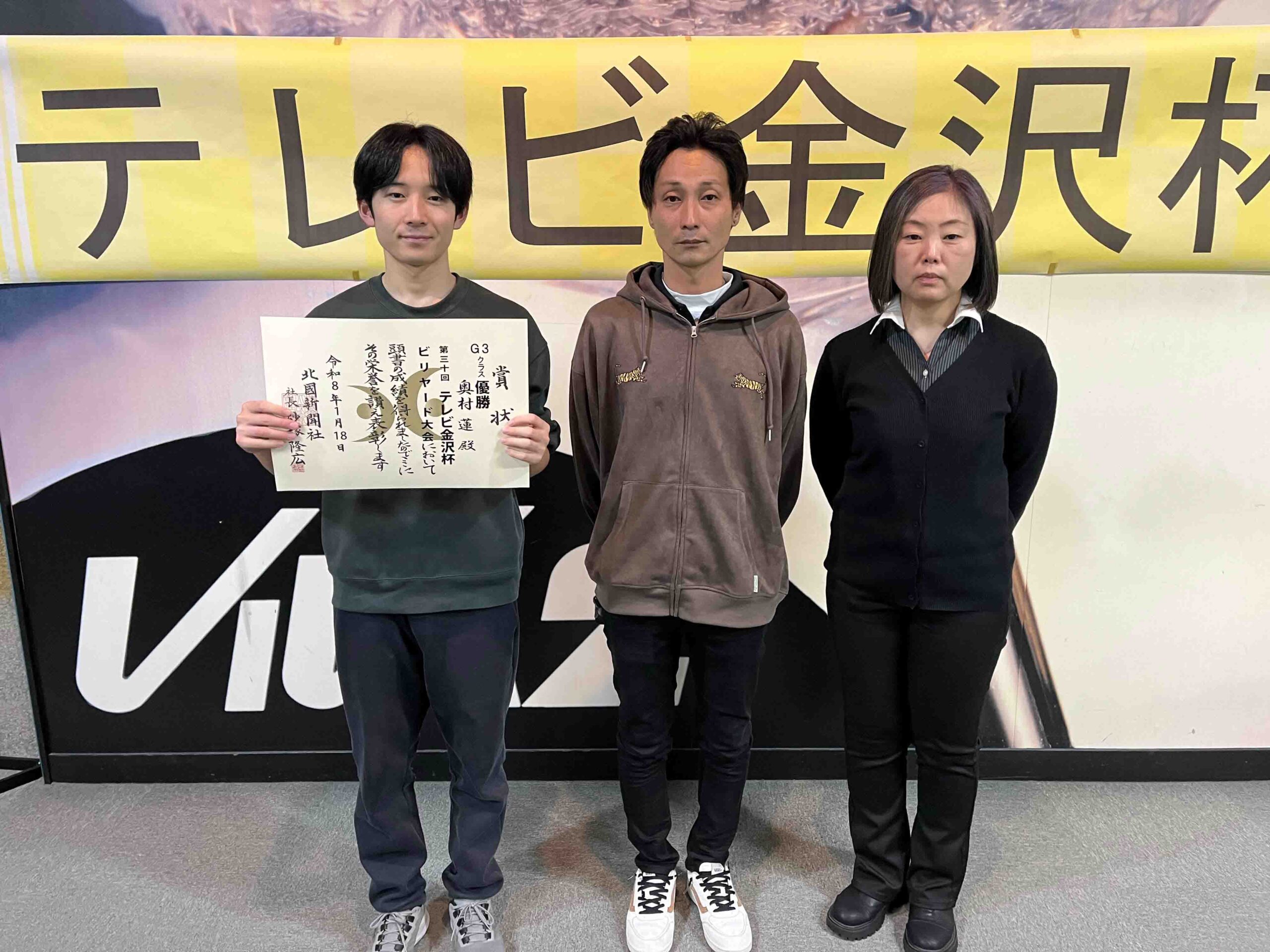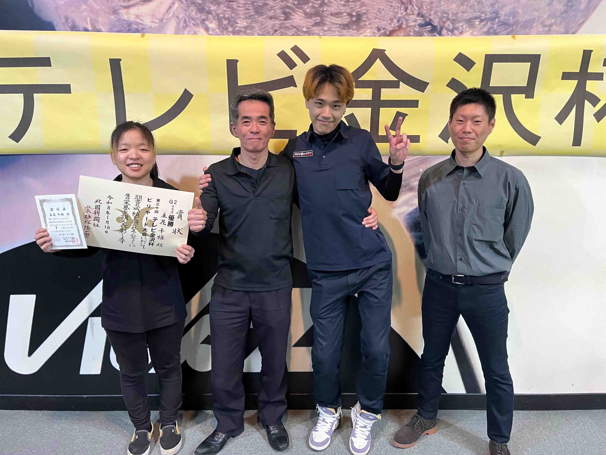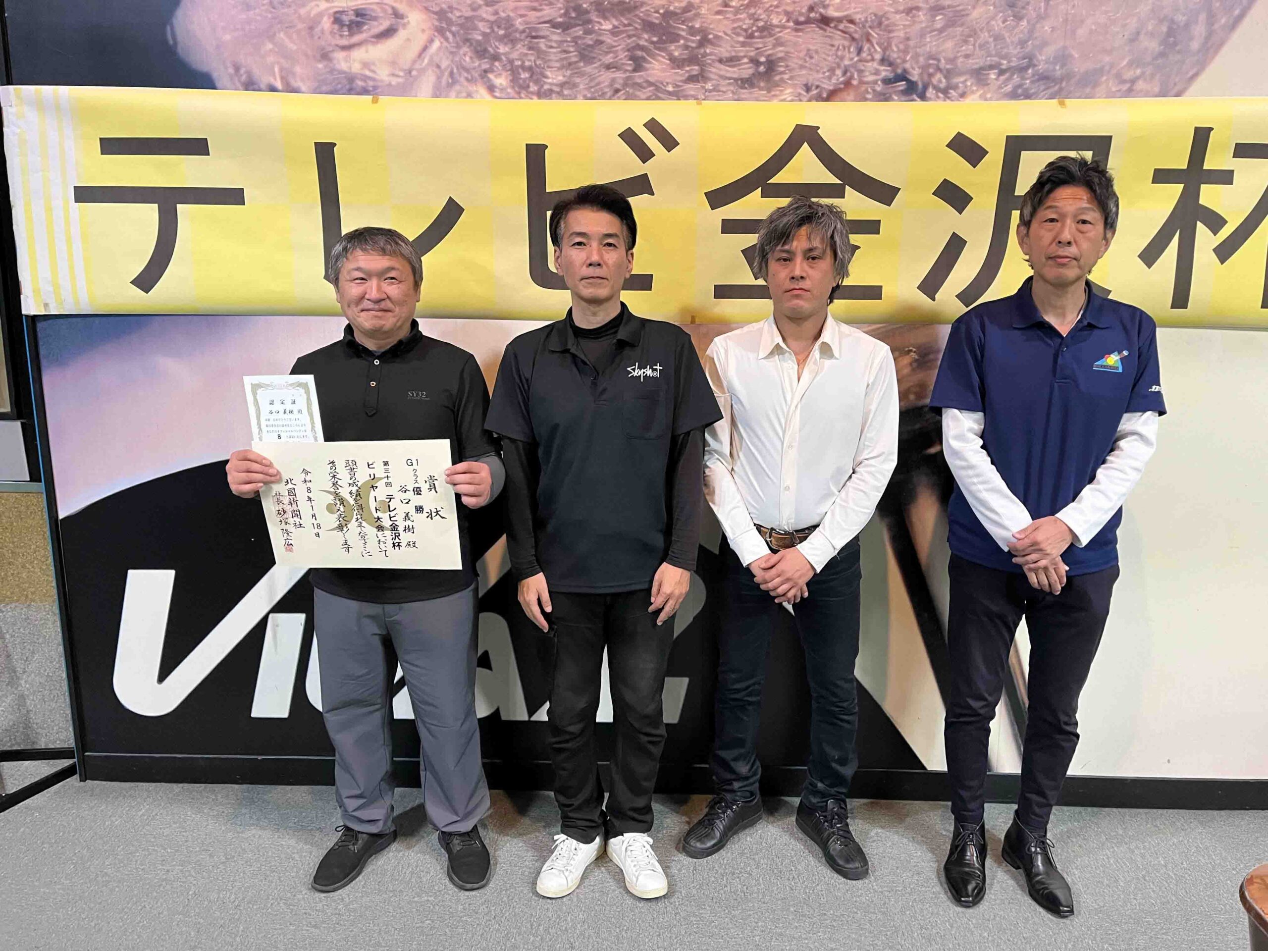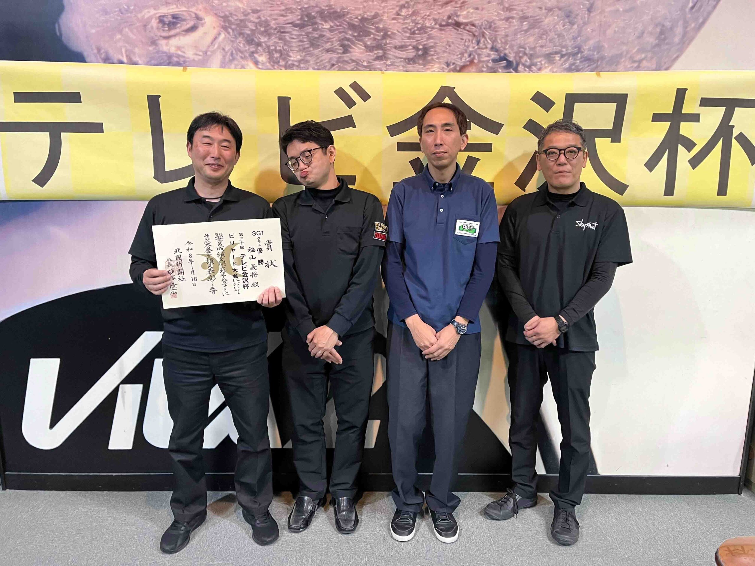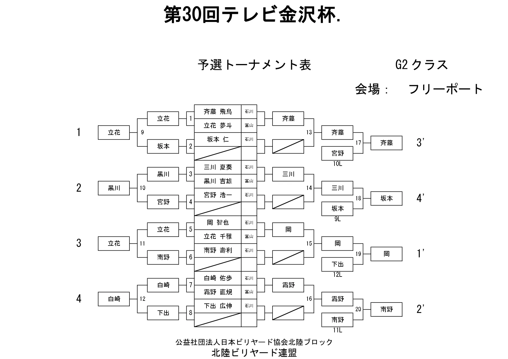 第30回テレビ金沢杯 試合結果 2026.01.19 Sクラス 優 勝山本 泰敬(TRC)準優勝河合 孝輔(FPBC)3位タイ楠戸 直也(石川)3位タイ立野 翔大(石川) SG1クラス 優 勝福山 義将(石川)準優勝藤野 公信(富山)3位タイ柳下 良太郎(福井)3位タイ須永 均(石川) G1クラス 優 勝谷口 義樹(福井)準優勝森 哲也(石川)3位タイ村本 健(石川)3位タイ中川 豪(福井) G2クラス 優 勝立花 千雅(富山)準優勝黒川 吉雄(富山)3位タイ立花 夢斗(富山)3位タイ白崎 佑歩(石川) G3クラス 優 勝奥村 蓮(富山)準優勝大田 知明(富山)3位山澤 裕香里(富山) G4クラス 優 勝田口 大惺(石川)準優勝岩田 拓人(富山)3位タイ平石 幸奈(石川)3位タイ入沢 雄一(富山)